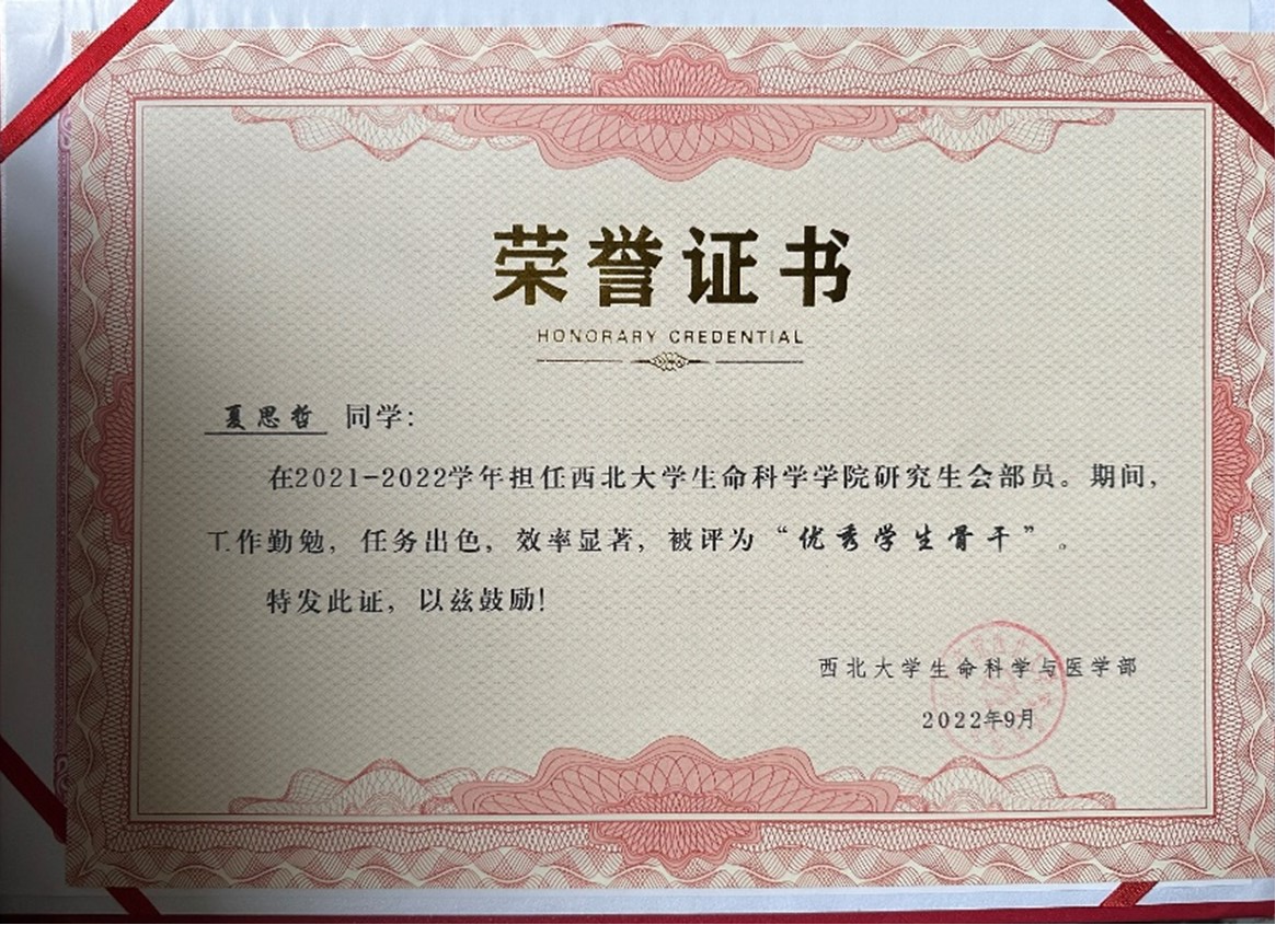 夏思哲,微生物学专业,2021级硕士研究生,在校期间学习勤奋努力,为人积极乐观,阳光向上。获国家奖学金一次,十大外围足球平台app一等奖学金一次,二等奖学金一次,三等奖学金一次。曾先后担任十大外围足球平台app科技协会成员、会长之职,负责组织开展各项学科竞赛活动,如挑战杯、互联网+等。同时协助团委老师处理日常事务,工作勤勉认真,任务完成较好,获十大外围足球平台app优秀员工骨干。曾作为组员参与第十一届挑战杯,获校级特等奖。研究生期间参与科技部基础资源调查项目“我国感染相关捕食性微生物资源本底调查” (项目编号:2022FY101100),发表专利一项(第四发明人)。现工作已签约至上药康德乐(北京)医药有限公司。