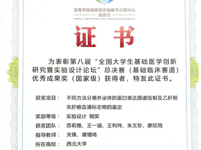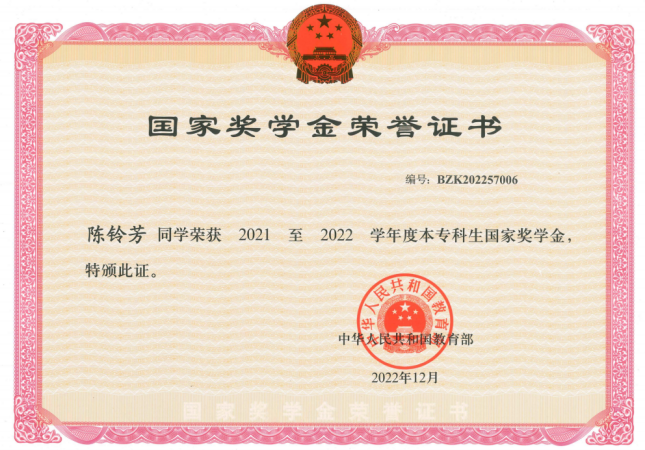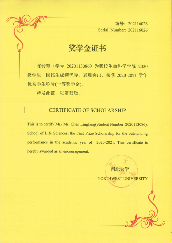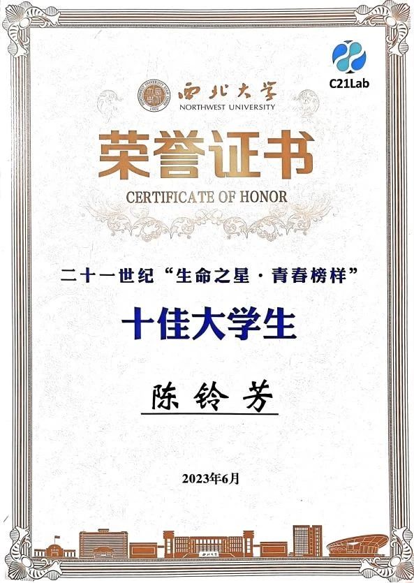 陈铃芳,自入学以来始终以学习为第一要务,勤奋刻苦,成绩优异。专业成绩和综合测评排名均名列前茅,曾获得国家奖学金、国家励志奖学金及校级一等奖学金等荣誉。在专注专业课学习的同时积极参与学科竞赛,参与的全国老员工生命科学竞赛与老员工创新创业大赛等都获得了国家级奖项。在大四学年参与公司与华大生命科学研究院的联合培养项目,进一步提升自身实验技能与科研思维。最终我凭借优异的成绩和出色的科研能力,成功推免至北京协和医公司基础公司,获得直博录取资格。积极参与员工工作,在担任筑梦先锋本科生党支部副书记期间团结同学,服务集体,认真履行职责。作为六人宿舍的舍长,带领宿舍成员互帮互助,连续三年荣获院级优秀宿舍及校级优秀集体的荣誉。