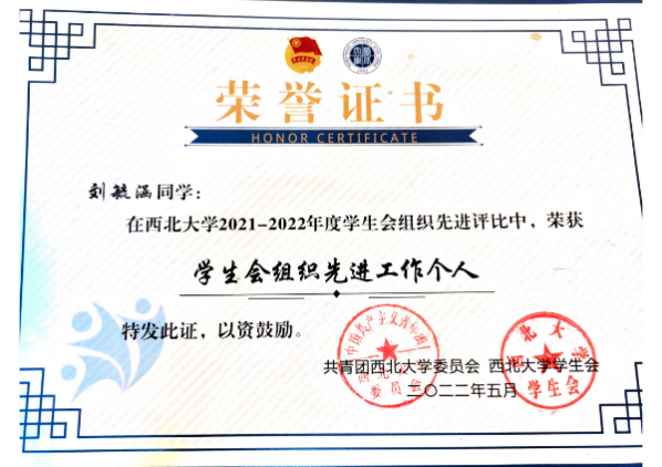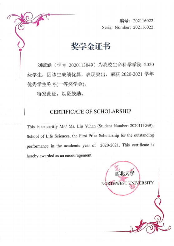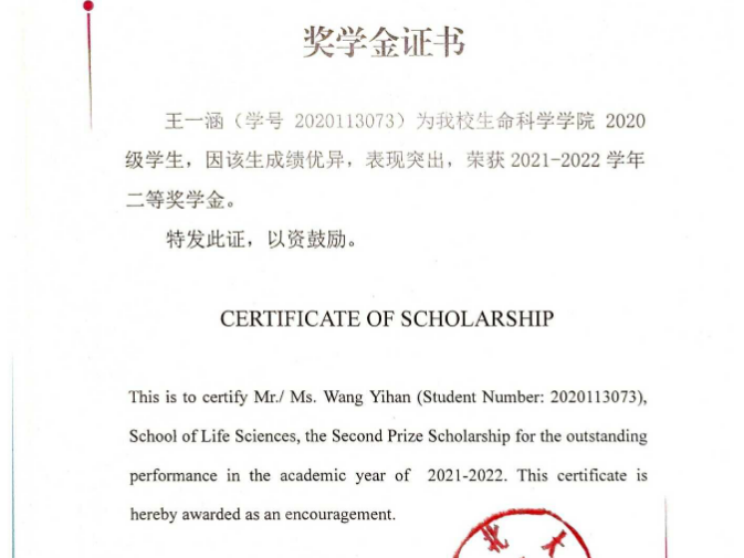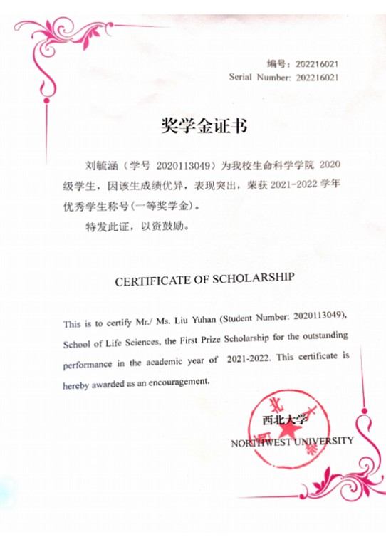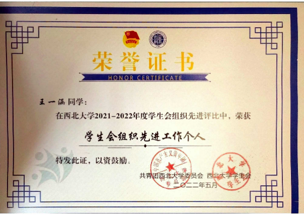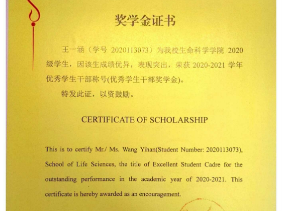 王一涵,来自十大外围足球平台app2020级生物技术专业,在本科学习期间,我努力学习,绩点3.45/4.00,以班级第一获得保研资格,我在大一期间担任班级团支书,大二至今担任班级班长,也曾担任校员工会组织建设部工作人员,热心为同学们服务。我曾获得国家励志奖学金、校级优秀员工干部奖学金、二等奖学金,荣获“十大外围足球平台app员工组织先进工作个人”荣誉,曾参加第八届全国老员工基础医学创新研究暨实验设计论坛并获得国家级铜奖。