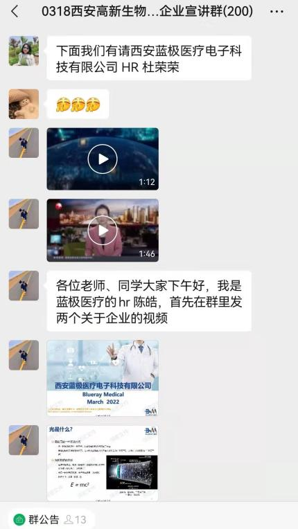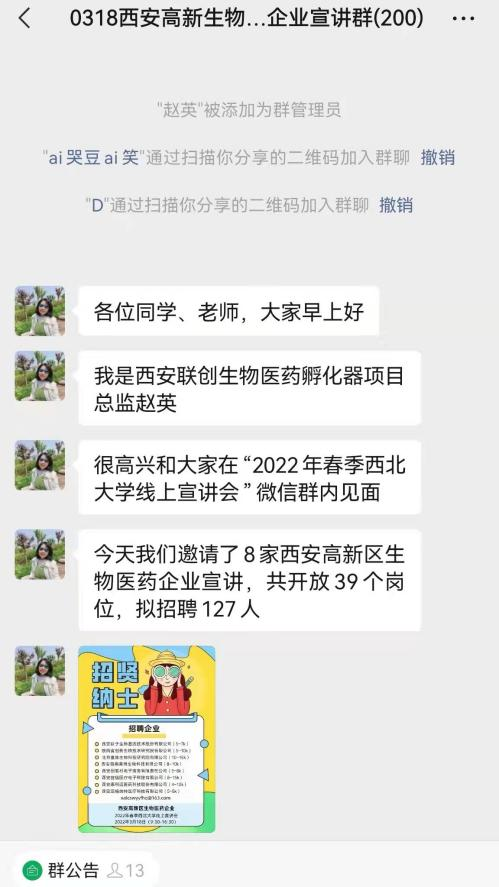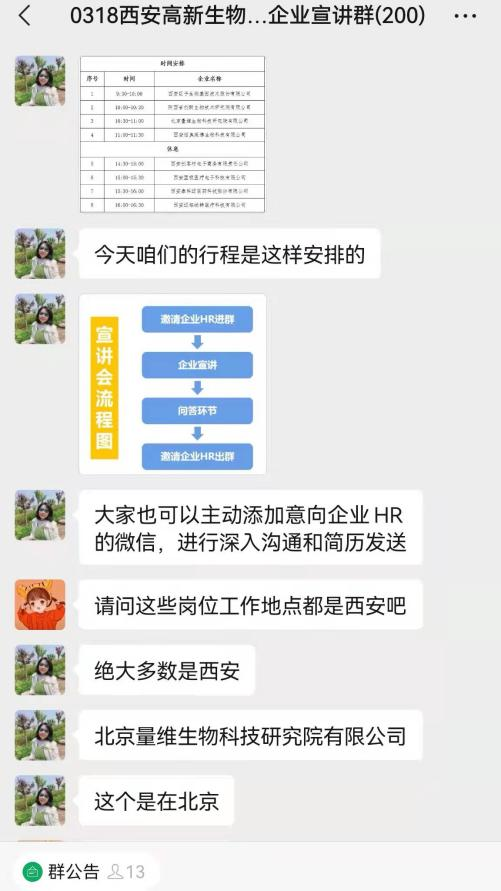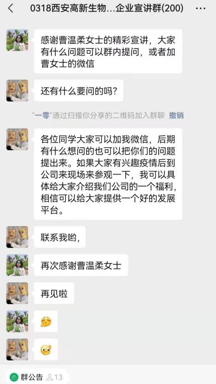 此次专场招聘会作为疫情防控形势下的一次大胆实践,前期通过毕业生就业需求广泛调研,积极联系西安联创并充分交流,利用线上渠道大力宣传,共计邀请了西安高新区8家优质生物医药企业参会,提供覆盖生物工程、细胞生物学、动物学、生物化学与分子生物学、中药学等若干学科对口岗位39个,拟招聘人员127人,充分满足了公司生物类、中药类员工的求职需求。宣讲群内采用各企业负责人分时段入群,首先介绍公司简况、工作内容、岗位需求以及招聘相关事宜,随后毕业生与企业问答互动的方式进行,毕业生们根据个人诉求积极提问,深入了解了职位信息、企业文化、福利待遇等问题。