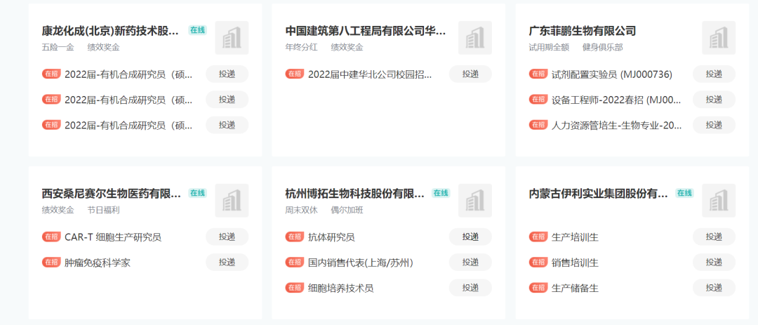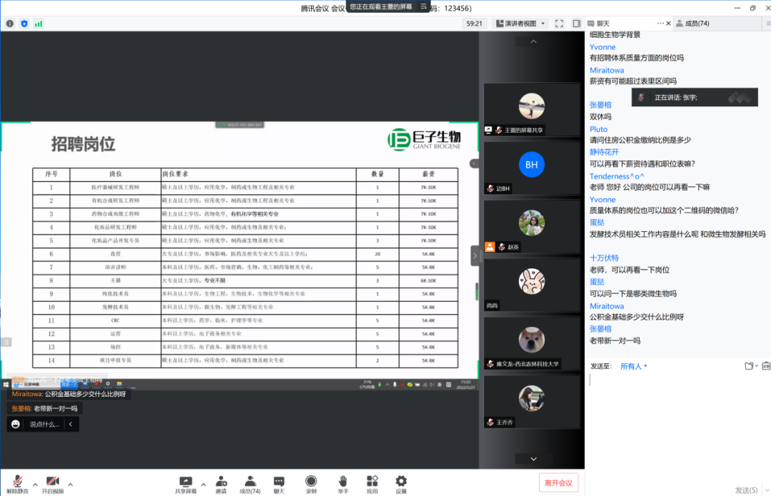 招聘会共有11家企业参与宣讲,提供岗位65个,拟招聘257人,岗位覆盖西安、苏州、上海等地,涉及材料、药学、有机化学、医学、临床医学、细胞生物学、机械电子、生物工程、生物技术、生物信息等二十余个专业。各企业负责人在线介绍企业信息并公布招聘职位,宣讲完毕即时与员工进行对话答疑,实现了高效沟通。公司广泛动员相关专业毕业生积极参与,力求员工能充分匹配用人单位和就业岗位。