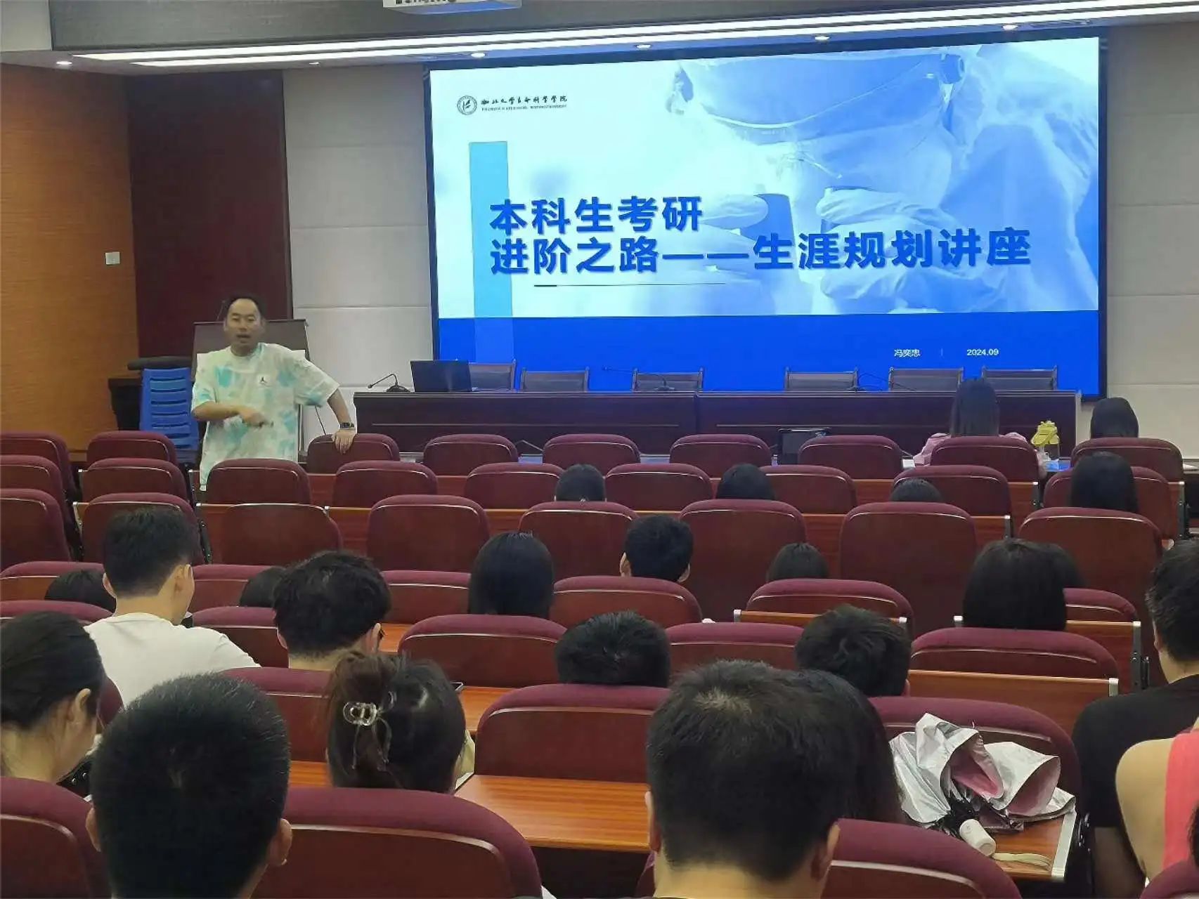 冯奕忠老师以“本科生考研进阶之路”为主题,以独到的视角将考研战略巧妙融入《孙子兵法》的精髓之中,向同学们提出“五事”考研规划法:道为方法,指引方向;天为时机,把握机遇;地为平台,筑基未来;将为氛围,择师而学;法则规章,规范自我。他提出,考研不仅是分数的较量,更是人生方向与专业规划深度融合的艺术:一是考研与人生方向的重要性,考研是同学们自己的大事,提醒考研同学不应仅以分数为终极目标,而应深入考虑专业选择与未来职业规划的关联性;二是考研选择导师的策略和重要性,强调了在考研过程中明确方向,筛选心仪导师并与导师建立联系的必要性;三是考研坚持与心态调整的重要性,强调不要被负面情绪影响,保持学习效率和积极态度。最后,冯老师鼓励同学们结合个人兴趣与职业规划,在追梦路上精准定位,勇于面对挫折与挑战,持之以恒,绽放光彩。