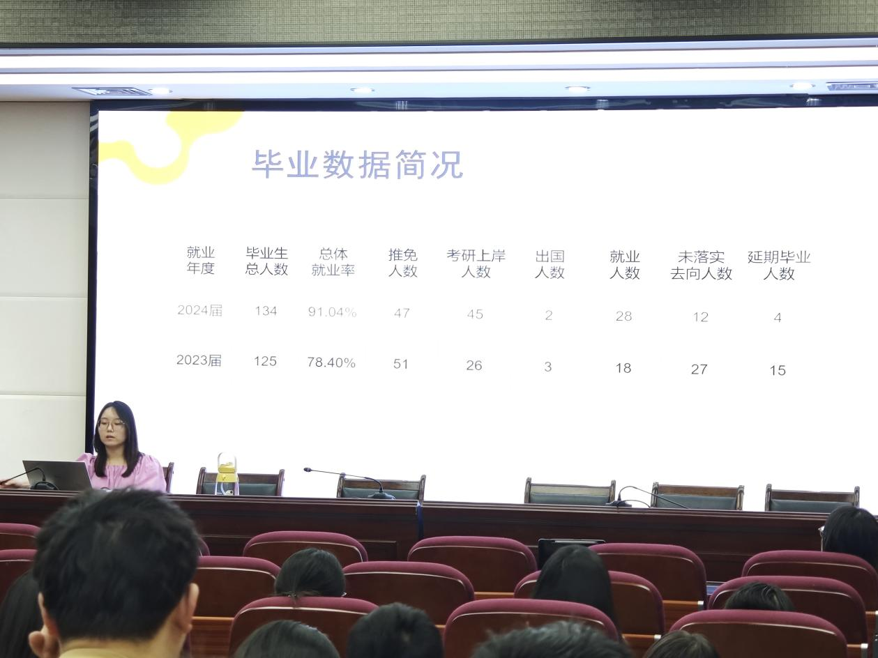郭佳惠老师以2023届、2024届两年来的就业数据为基础,向同学们详细分析了公司近两年的本科毕业生升学、就职情况,展示了考研趋势分析及就业单位统计报告,为大家勾勒了一幅清晰的升学与求职指引图。通过23届、24届本科生考研上岸数量与录取院校的变化,郭老师向同学们剖析了考研选择的重要性,分析了各种报考情况的优势与劣势,提醒同学们应未雨绸缪,提早做好规划与选择,并善于挖掘各类资源。通过对“升学”“求职”“考公”三类热门毕业选择的分析,郭老师围绕当前就业形势提出了多元化发展的策略建议,鼓励同学们拓宽视野,灵活应对,无论是继续深造、投身职场还是公考之路,都应结合自身实际,努力提升自身综合实力,制定科学合理的应对计划,并建议大家适时调整就业观念,不应将全部希望寄托于单一选择。最后,郭老师针对就业管理系统、就业指导活动、就业渠道、签约手续等进行了讲解,解答了同学们升学、求职过程中的疑惑。