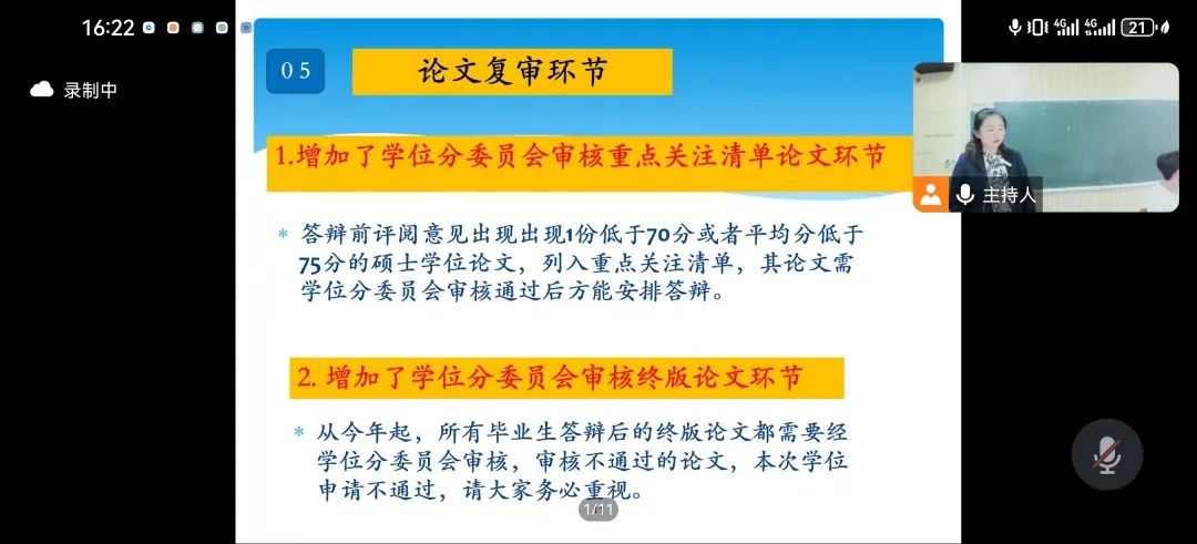 曹清艳老师详细讲解了硕士研究生申请学位的常见问题,首先介绍了学位申请的整个流程,确保毕业生对申请步骤有全面的了解,随后针对科研成果要求、学术不端要求、论文盲审要求及论文复审环节进行了清晰的说明。她强调,科研成果是申请学位的重要评判标准,希望同学们能够重视科研工作,努力取得优秀的成果。同时提醒同学们在科研过程中要严格遵守学术道德,确保论文的原创性和真实性,因为不端行为检测的结果将直接影响学位申请。通过曹老师的讲解,同学们对整个学位申请流程及注意事项有了更全面的认识。
