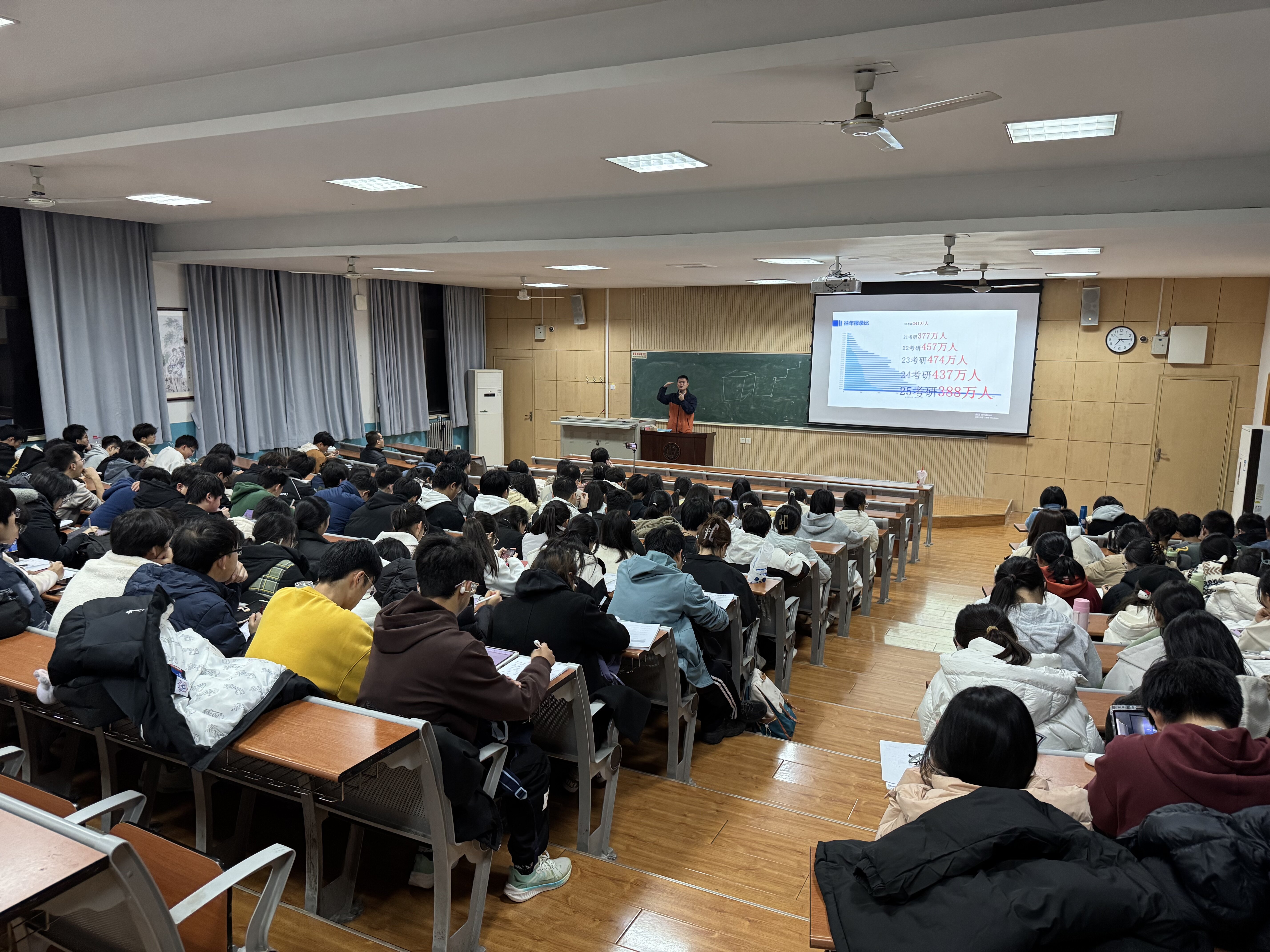 王墨钊老师首先展示了近六年来的考研人数与报录比,分析了考研形势,强调在当前就业环境趋于严峻的背景下,考研已成为许多同学的重要选择,也使得考研难度逐渐攀升。他对同学们普遍关注的考研相关内容进行了深入解析,着重分享了考研与高考的区别、研究生教育分类、专硕与学硕的区别、学科门类划分以及各类考试科目的内容要点。随后,王老师聚焦生物医药类专业考研方向,围绕公司近四年来复试分数线、报录比、招生计划等具体数据,结合其他热门院校录取情况,指导同学们如何根据自身特长和优势进行个人定位,设定合理的升学目标。