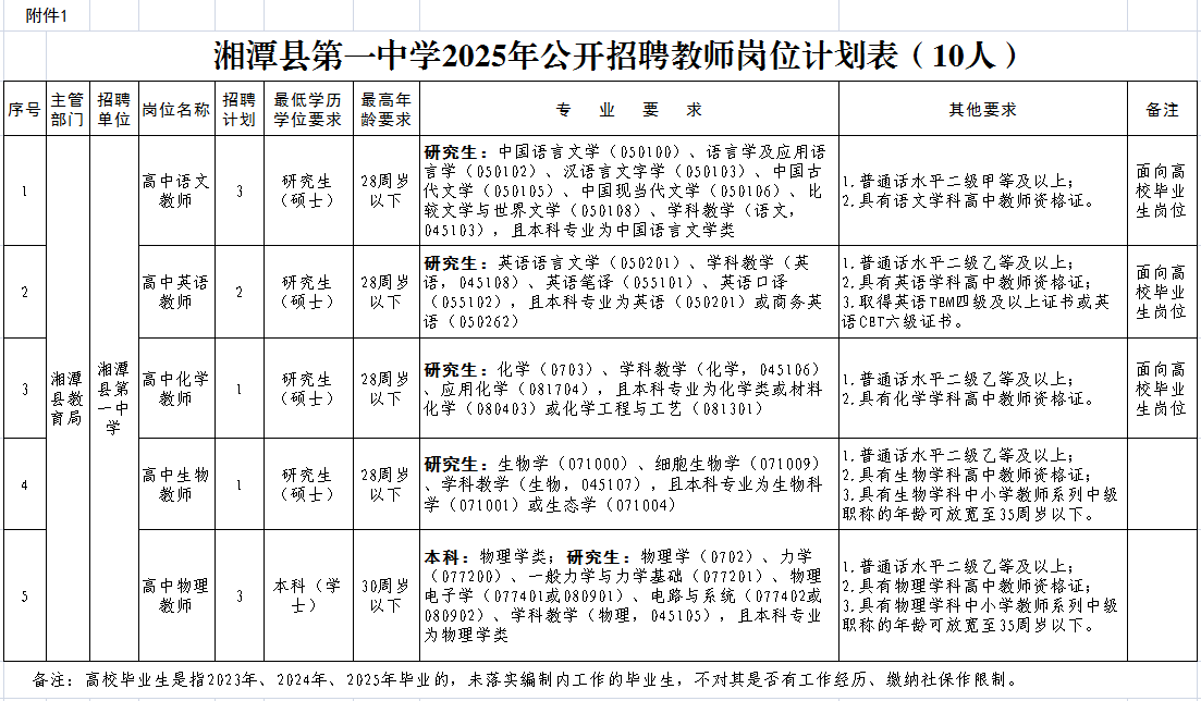 (五)应届毕业生包括2025年毕业及择业期内(2023、2024年毕业)未落实工作单位毕业生(未签订劳动合同、未缴纳社会保险)。2025年届毕业生可先行报名及考试,经考试、体检、考察、公示,并于2025年7月31日之前取得毕业证书、学位证书、对应学科高中教团队格证书的,可按规定聘用,否则不予聘用。
