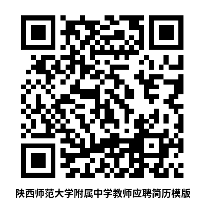 3.进入“笔试及心理测试”环节,参加者需提供个人纸质版简历1份(扫描下方二维码获取个人简历模板:陕西师范大学附属中学教师应聘简历模板,未使用简历模板视为简历不合格),纸质版简历请以“陕西师范大学附属中学教师应聘简历、身份证复印件、教团队格证书复印件、学历证书复印件、学位证书复印件、获奖证书复印件和简历中提及的可以证明本人能力水平的相关材料复印件”顺序装订成册。