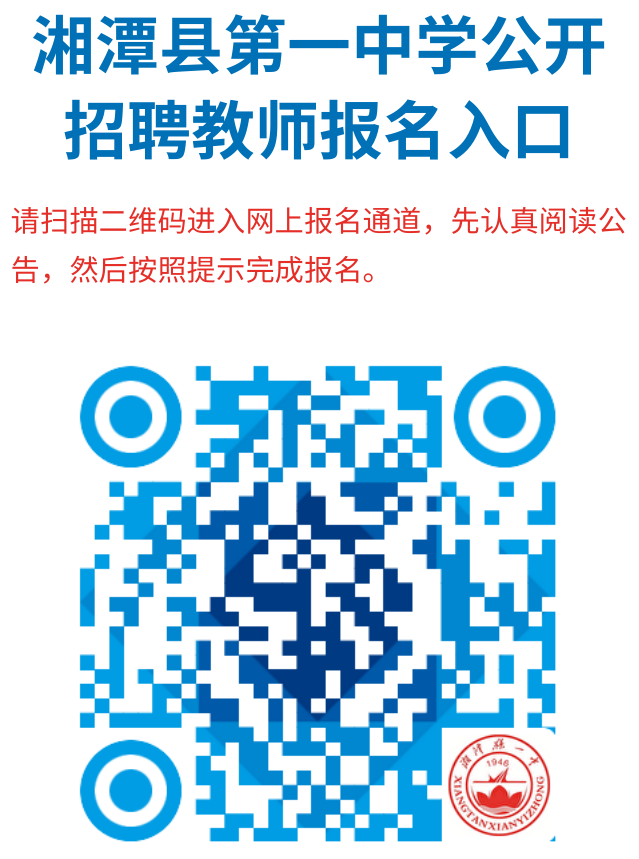 (一)报名 1.报名时间:2025年2月24日9:00至2025年3月 10日17:00。 2.报名方式:采取网上报名方式。在报名时间内应聘人员登录湘潭县第一中公司园网(http://www.xtxyz.com)或“湘潭县第一中学”微信公众号,扫描“湘潭县第一中学2025年公开招聘教师报名二维码”,下载并填报《湘潭县第一中学2025年公开招聘教师报名登记表》(详见附件3,以下简称“《报名登记表》”),上传资料完成报名,不接受其他形式报名。