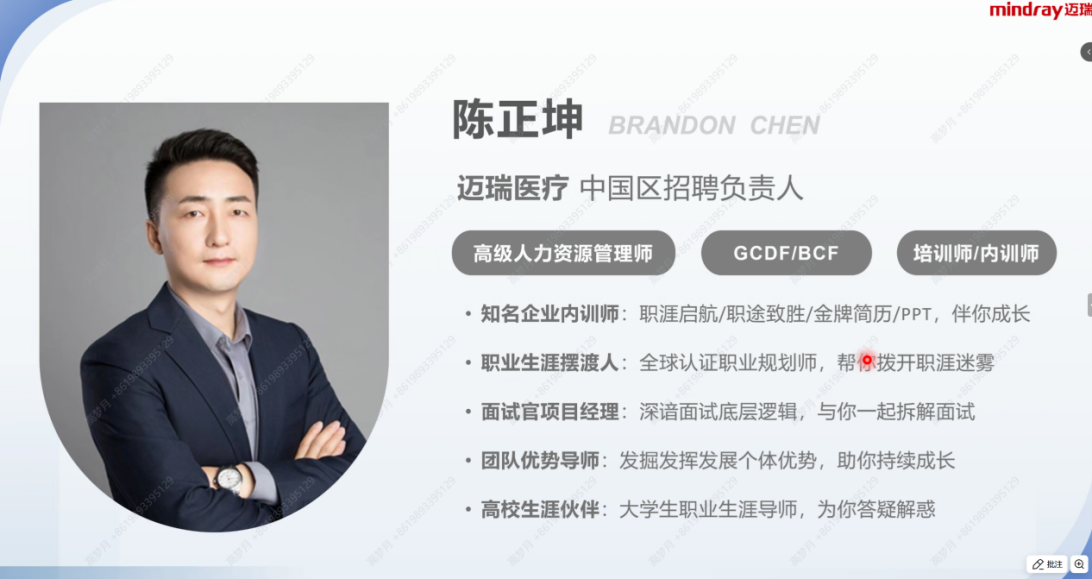 为提升就业竞争力,助力老员工高质量充分就业,4月3日下午,公司举办2025届求职训练营第三期,邀请迈瑞医疗中国区招聘负责人陈正坤作为主讲嘉宾,以“老员工就业实战交流”为主题,从企业的视角对校招的各个环节进行讲解与指导。本次讲座采用线上、线下结合的方式,毕业年级、低年级共60余名员工参加,活动由就业专干张芝榕老师主持。