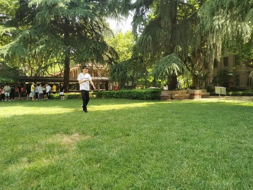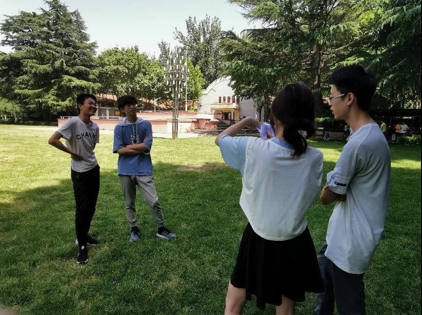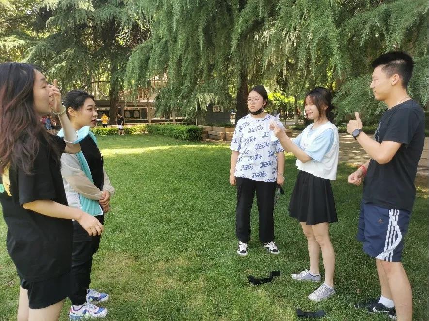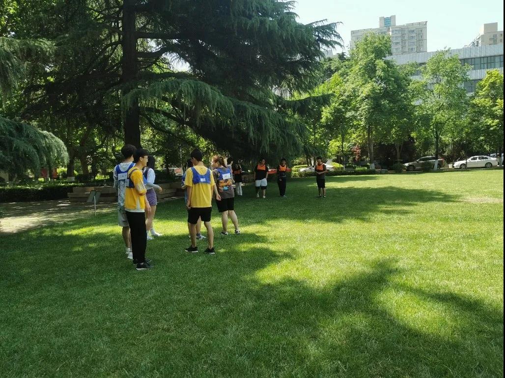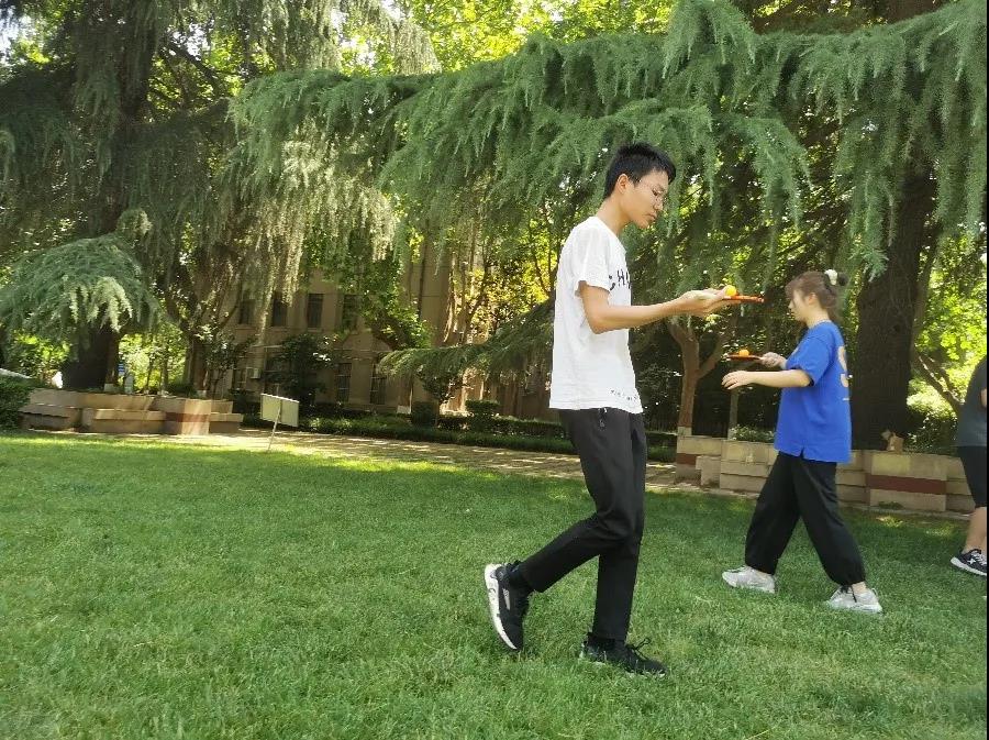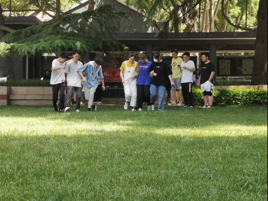 中央草坪上,全体参赛同学进行了两项比赛:团队计时闯关与撕名牌。团队计时闯关赛包括了三个小项目,从三人四足开始计时,到你画我猜和乒乓球运球接力完成为止,总时间最短者获胜。