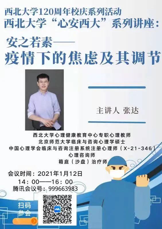 西安疫情来势汹汹,封闭焦虑无处不在,防疫不仅护体,更需“护心”。希望同学们通过此次讲座,能够坦然面对焦虑,科学调节情绪,学会同压力相处,与焦虑共舞,抗击疫情,以“心”战疫。