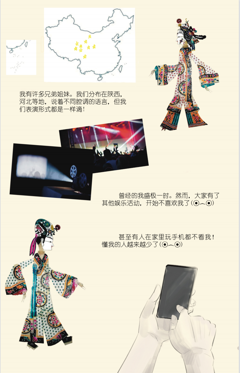 此外,团队成员还做了一个大胆的尝试:将“帝王紫”与陕西的皮影文化有机融合,他们在前期走进地方深入调研了皮影文化,了解其市场发展及行业动态,将所获成果以讲座报告的形式向公众推广。