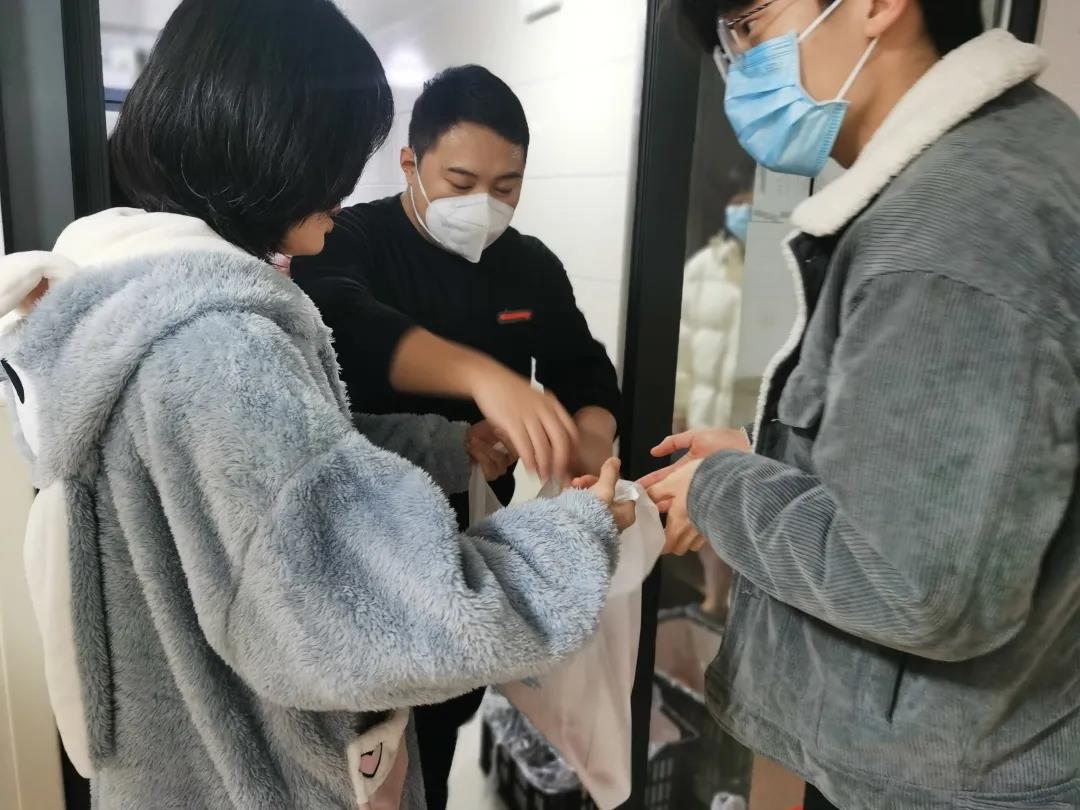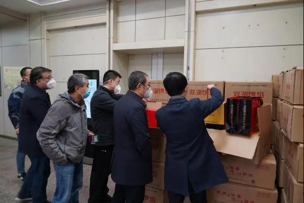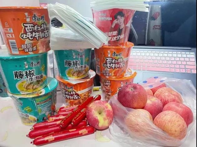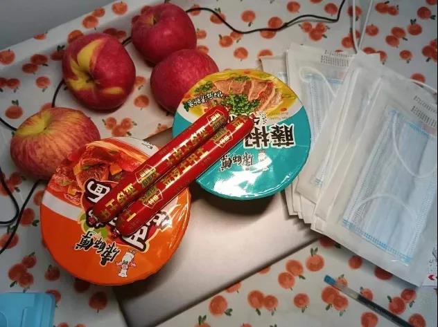 学部同样没有忘记远在附属医院实习的27名同学,带领物资前去看望,让大家实现人手一份苹果香肠方便面,口罩馃馅煮鸡蛋的梦想。