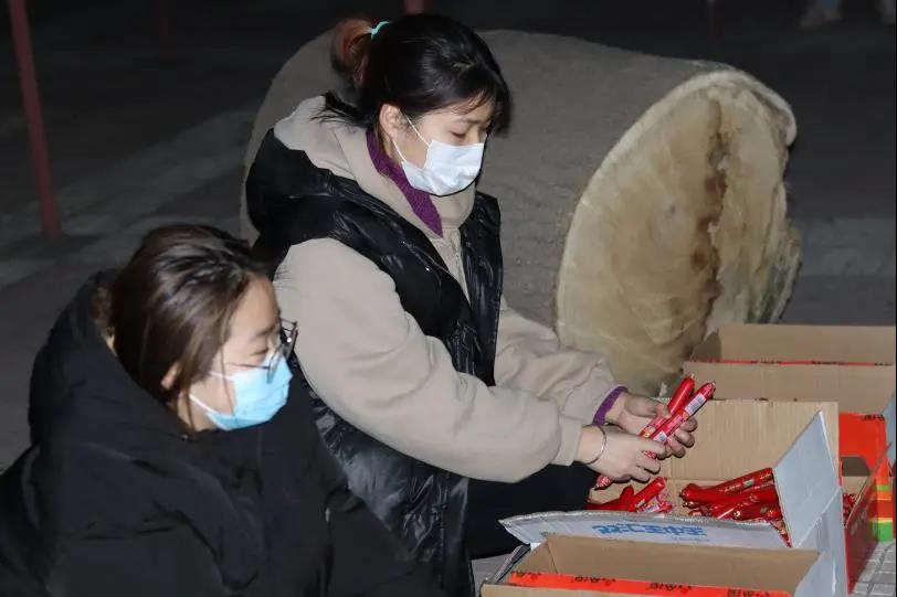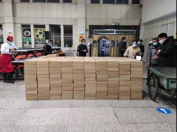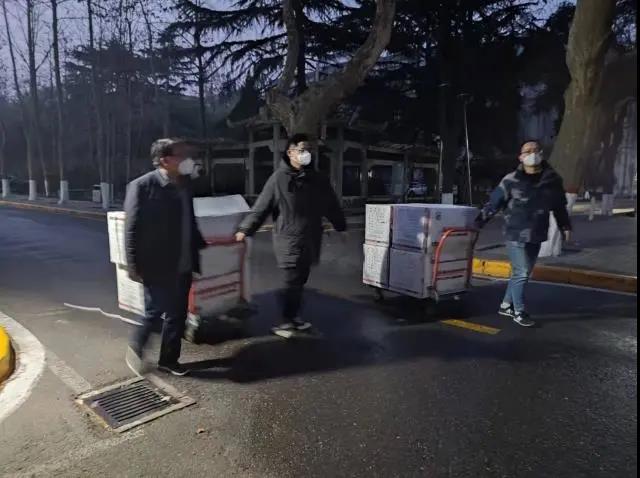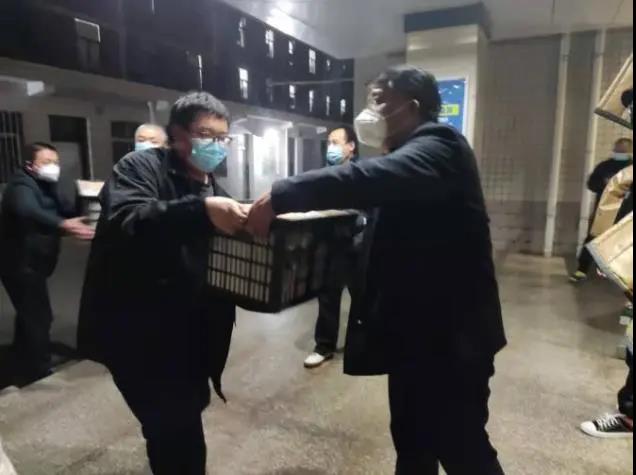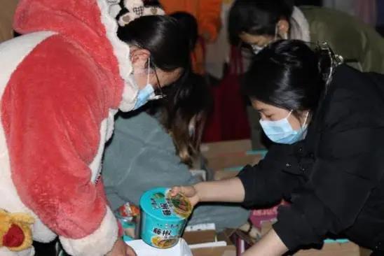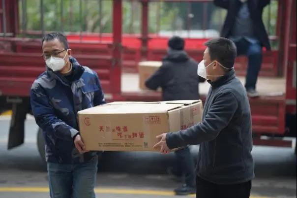 天色渐暗,老师们与时间赛跑,不顾严寒,忘却疲惫,争分夺秒为同学们卸载、分装、搬运物资,只盼望同学们能早些品尝到满当当的爱意,收获沉甸甸的幸福。