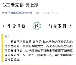 问题导向,选好教育点。根据员工心理状况阶段化、动态化特点,结合入学季、学期初、学期末、考研后、毕业前等重要时间节点,坚持问题导向,开展环境适应性、人际关系指导、耐挫性、压力应对、情绪调整等教育活动,提高了宣传教育的精准度。