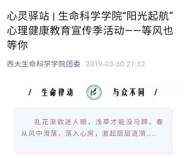 打造一类品牌活动。连续6年开展“阳光护航”心理育人宣传季,常态化开展“我与教授面对面”分享活动、“与心灵对话”观影活动、“书香致远,阳光护航”心理读书月活动、“一封家书”寄送活动、“奔跑吧!太白三叶草”素质拓展活动、“一沙一世界”沙盘体验团辅等活动。