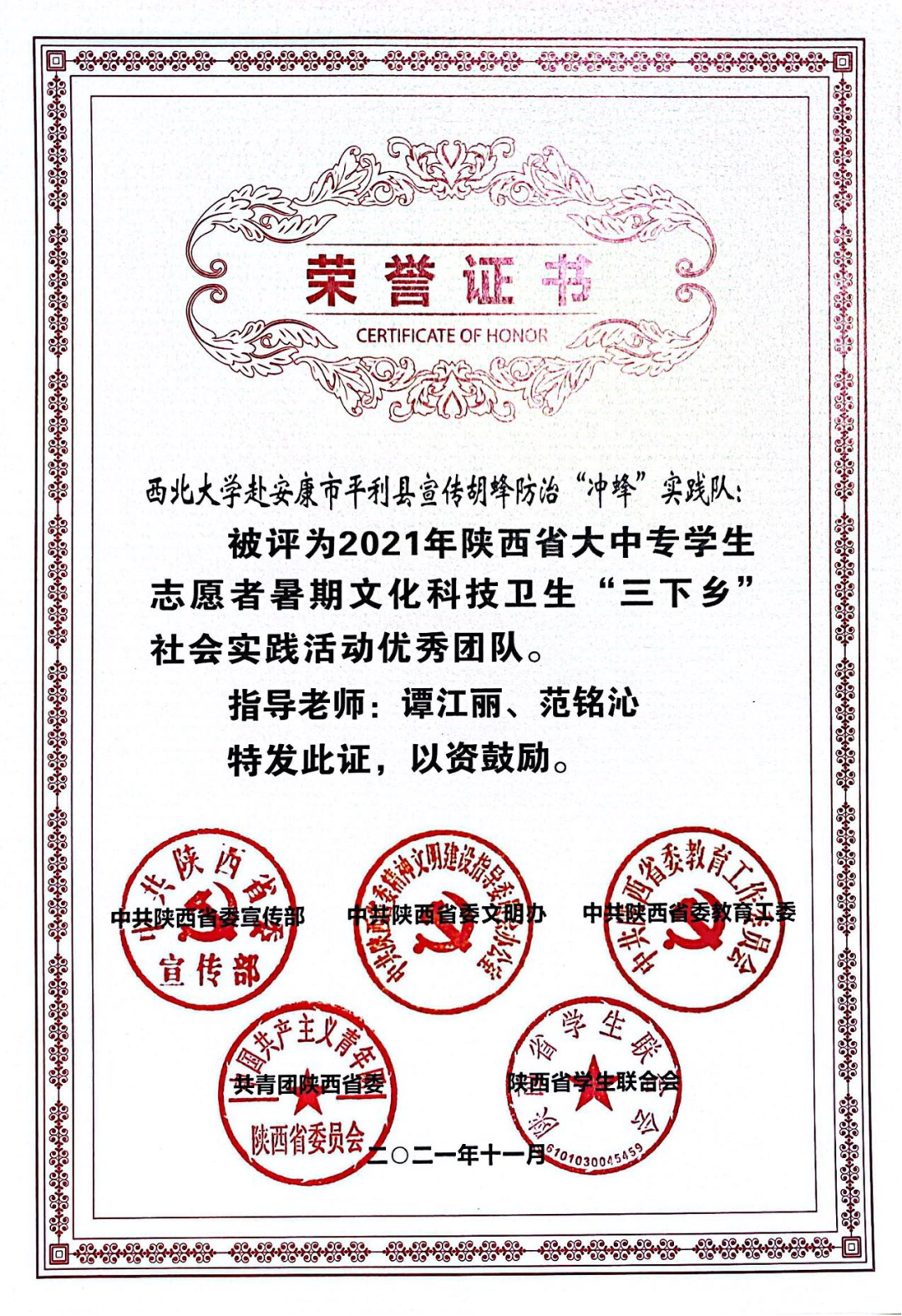 自2019年始,公司团委每年组织暑期三下乡社会实践队伍前往安康市多地县区开展胡蜂防治的宣传与帮扶,至今为止,在公司的支持下,谭江丽、范铭沁与冯奕忠老师的指导与带领下,公司青年志愿者们已在安康市平利县、岚皋县、紫阳县设立胡蜂防治点50余个,印发胡蜂防治宣传折页2000余张,公司谭江丽教授为当地授“胡蜂危害防治”讲座10余场。四年来,本项目也取得了卓越的成绩,本项目的指导专家教授谭江丽基于此项目编撰的“等闲识得胡蜂面-图说胡蜂的认识和防治”书籍已经出版并在岚皋县、平利县与紫阳县收到了较好的反响,同时在2021年,谭江丽教授获得了“十大外围足球平台app脱贫攻坚先进个人”荣誉称号,范铭沁获得了“2021年陕西省大中专员工志愿者暑期文化科技卫生‘三下乡’社会实践活动先进个人”荣誉称号,“冲蜂队”获得了“2021年陕西省大中专员工志愿者暑期文化科技卫生‘三下乡’社会实践活动优秀团队”荣誉称号。