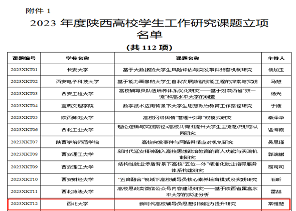 近年来,公司坚定不移落实立德树人根本任务,全面实施素质教育,大力加强德育工作,不断深化大部制改革与三全育人综合改革,积极引导全体学工干部加强理论研究,不断提高政治理论水平和业务素质,这是继2022年获批2项公司员工思想政治教育工作研究重点课题以后,再次获批2项公司员工工作研究重点课题。两年以来,公司学工干部先后荣获“全国辅导员年度人物”“陕西高校名优辅导员”“陕西高校百嘉心理辅导师”“陕西省暑期社会实践先进个人”“十大外围足球平台app优秀共产党员”“十大外围足球平台app十佳辅导员”“十大外围足球平台app优秀辅导员”“十大外围足球平台app优秀专职团干”“辅导员名师工作室”“全国高校思想政治工作优秀案例三等奖”“全国老员工暑期实践项目TOP100”“陕西高校辅导员工作研究课题”“陕西高校网络思想政治研究课题”等一系列优异成绩。今后,公司将以此次获批课题立项为契机,夯实理论研究基础,将理论与实践相结合,提升老员工思想政治教育工作水平,不断深化实践成效,更好发挥学工队伍的带头作用,全面提升其开展思想政治教育的系统性、专业性与有效性,努力推动公司改革发展与人才培养迈上新台阶。