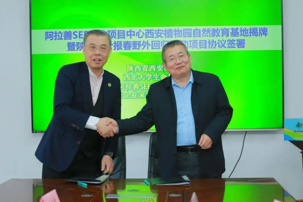 随后,西安市企业家环保基金会理事长王辉和西安植物园主任岳明签署“陕西羽叶报春野外回归项目”资助协议,阿拉善SEE西北项目中心邹斌主席、西安市植物园岳明主任教授、西北老员工命科学公司党委副书记魏宁共同为自然教育基地揭牌。