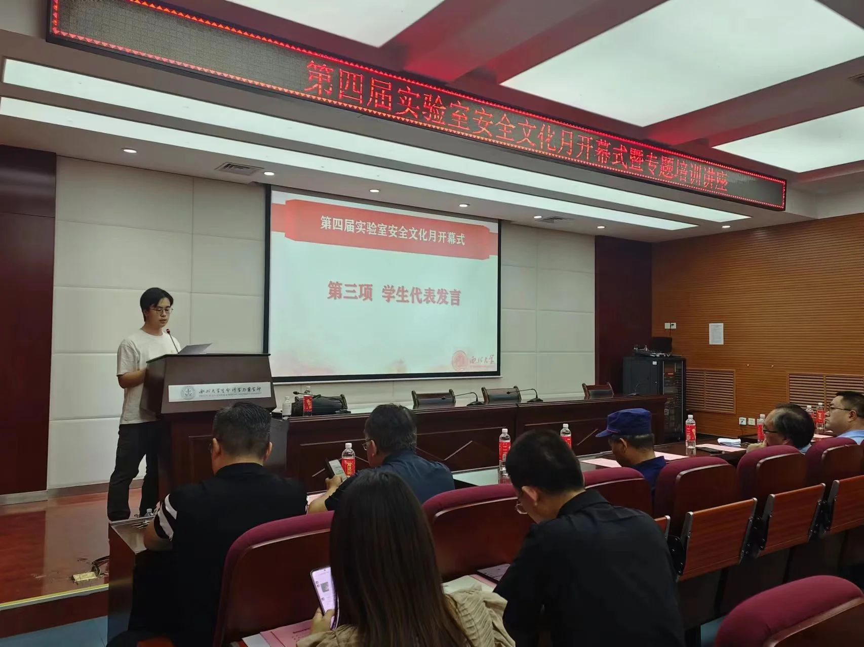 2023级生物化学与分子生物学专业硕士研究生王震作为员工代表发言。他从员工的角度讲述了实验室安全的重要性,从实验室设备的正确使用与维护、实验室环境的整洁与卫生、实验室应急预案的制定与实施三个方面对于维护实验室安全进行了表态,代表全体同学郑重承诺,将严格遵守好实验室的各项规章制度,积极参加实验室安全文化月系列活动,与同学们携手共进,共同打造一个和谐、有序且安全的实验室科研环境。