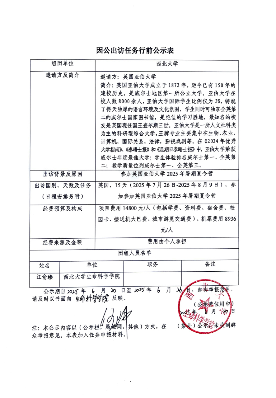 因公出访任务行前公示表
