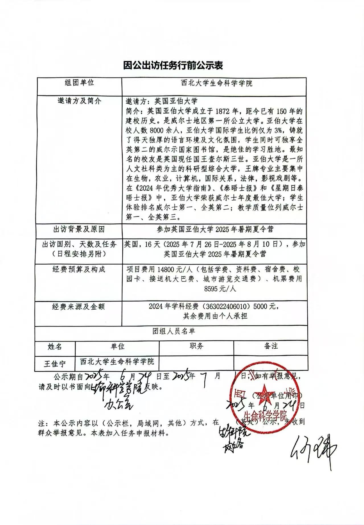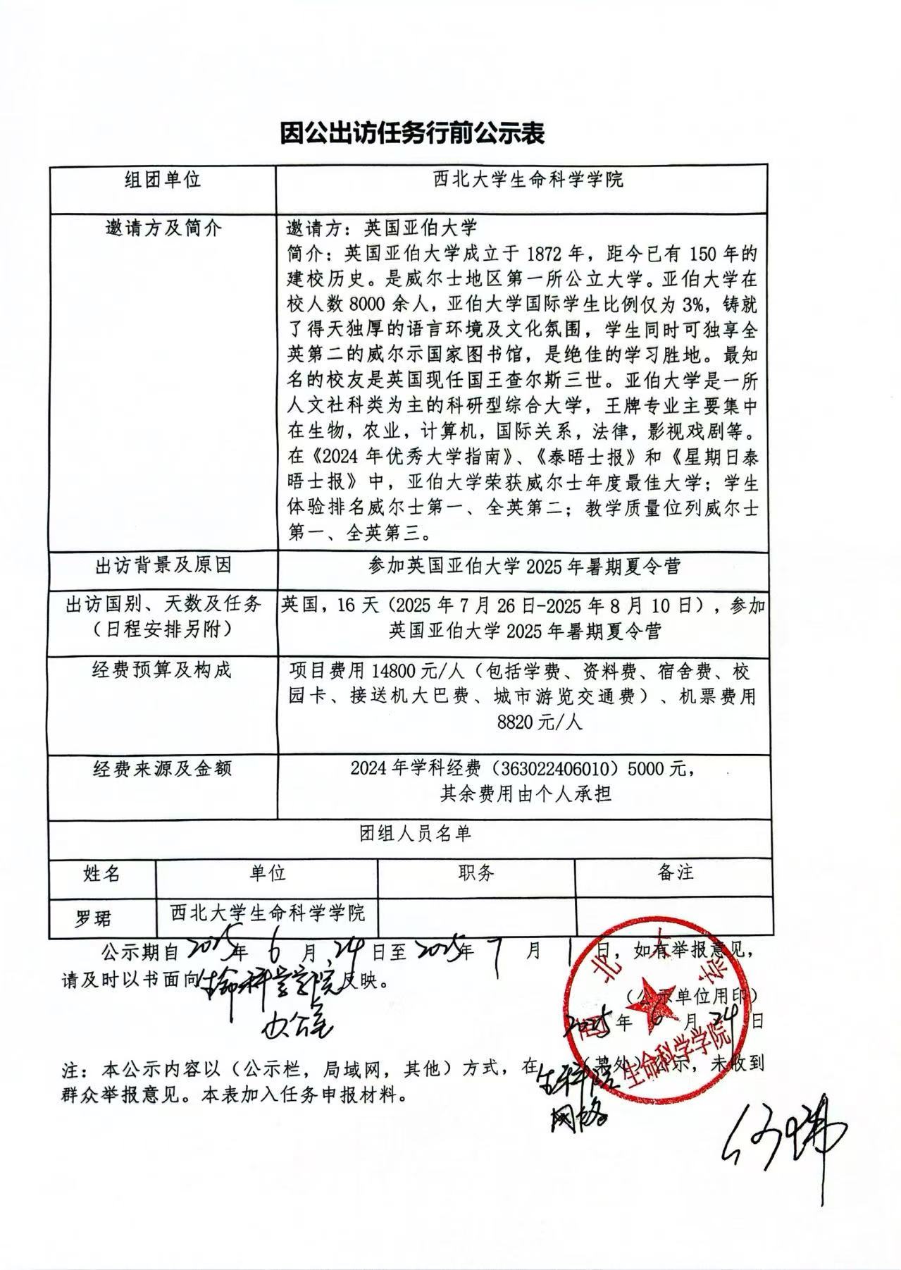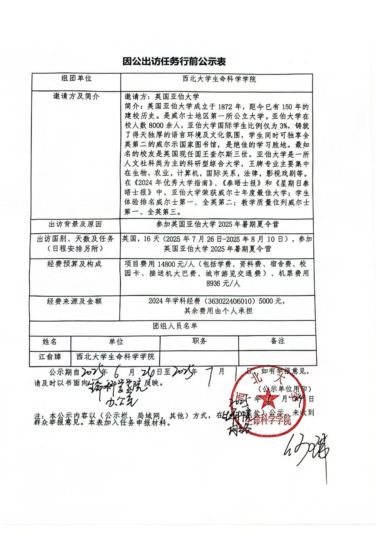 因公出访任务行前公示表