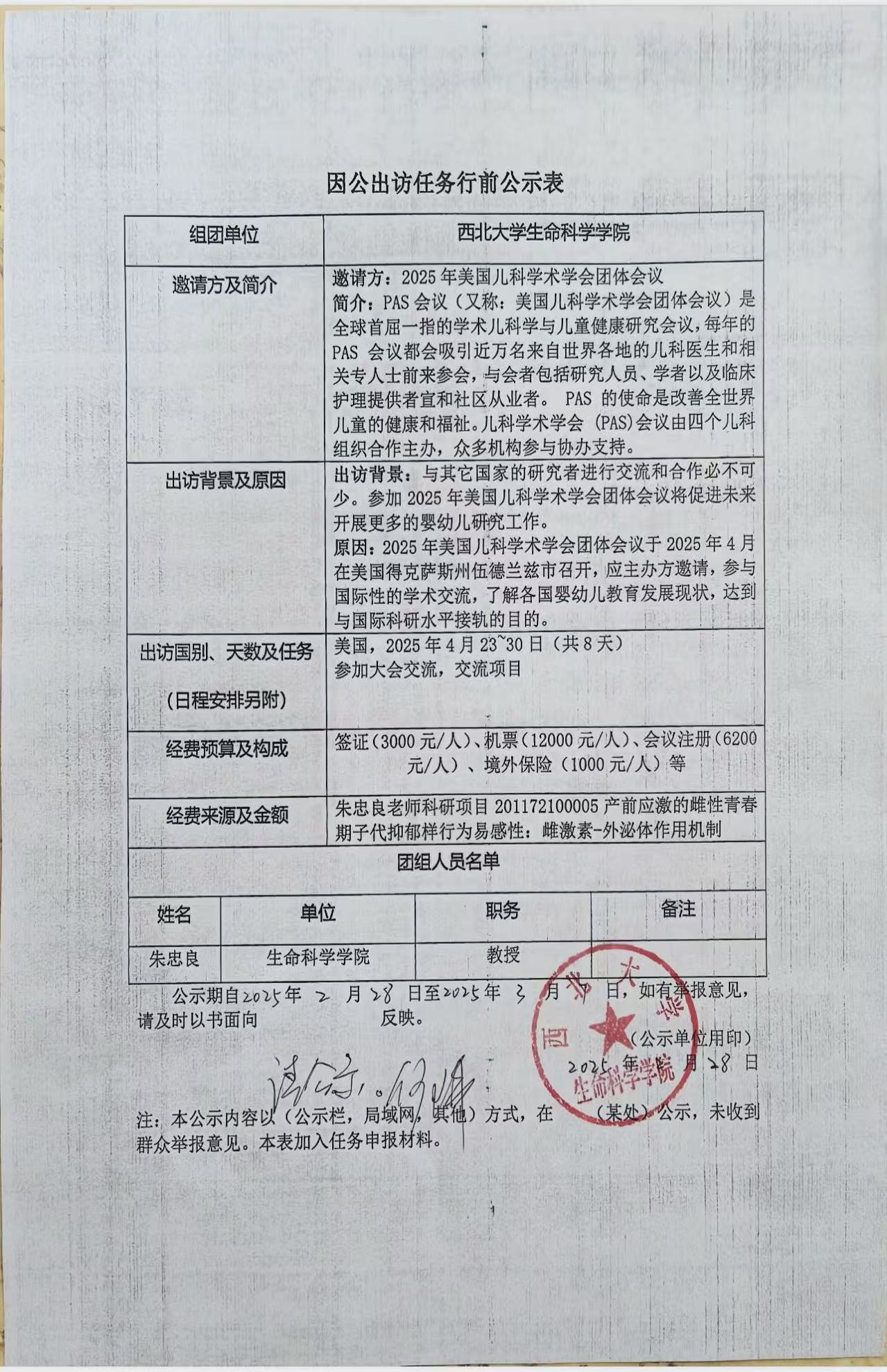 因公出访任务行前公示表