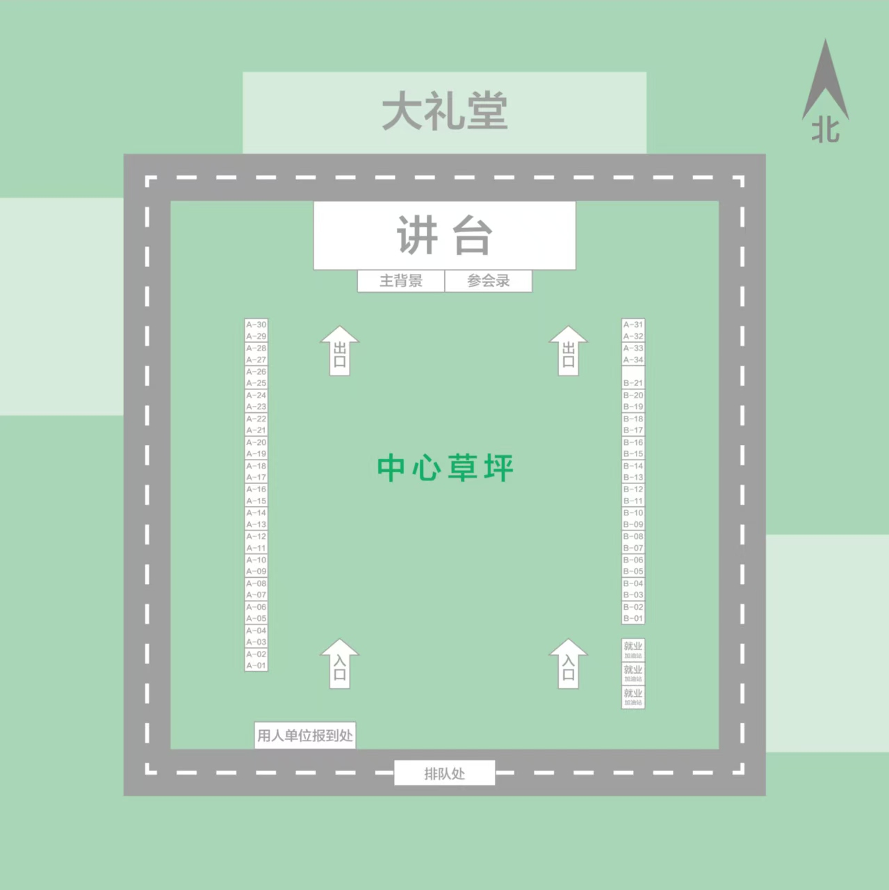 招聘当天,求职员工持本人员工证/一卡通/简历,从会场入口处(草坪南侧)排队有序参会。