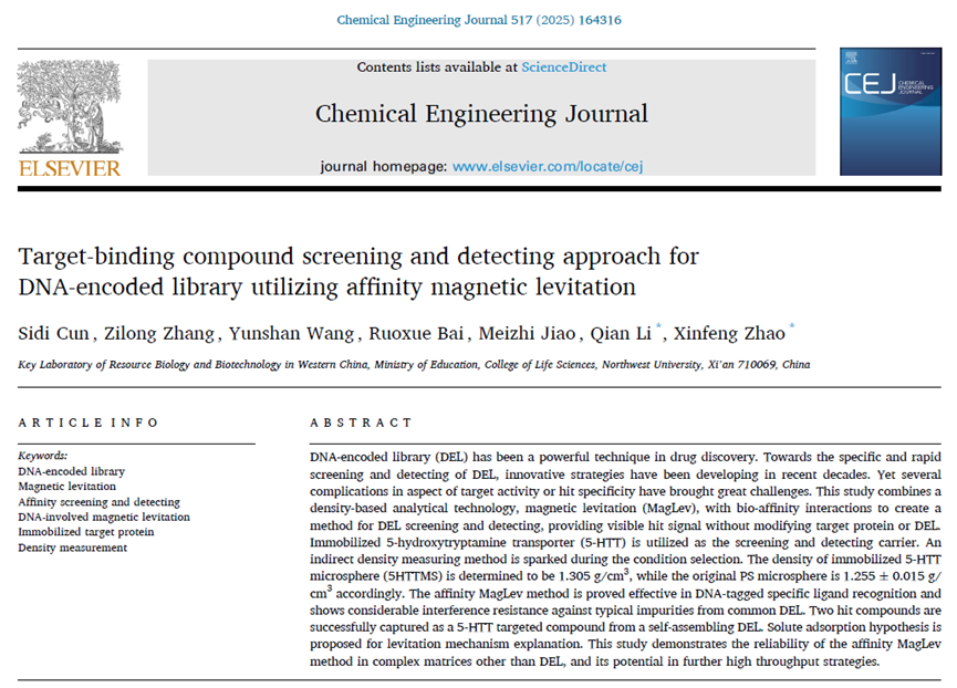 近日,十大外围足球平台app李倩/赵新锋团队在国际工程技术权威杂志Chemical Engineering Journal(中科院1区Top)在线发表了题为“Target-binding Compound Screening and Detecting Approach for DNA-encoded Library Utilizing Affinity Magnetic Levitation”的研究论文,报道了一种基于亲和磁悬浮技术的DNA编码化合物库筛选与检测方法。