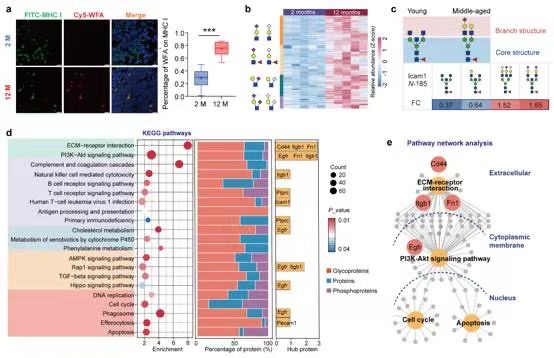 图2. 胸腺衰老过程中主要糖链结构变化及调控网络分析。a) LacdiNAc升高; b) 唾液酸(Neu5Ac和Neu5Gc)上调;c) 同一位点上的糖链结构重塑;d-e) 糖基化改变参与的信号通路(d)和通路网络(e)。