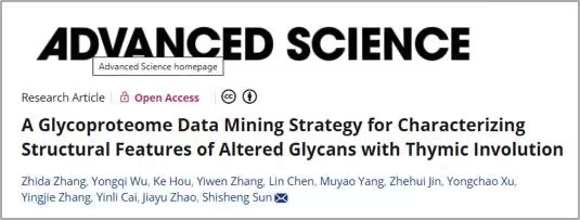 近日,十大外围足球平台app孙士生教授团队在Advanced Science发表了题为“A Glycoproteome Data Mining Strategy for Characterizing Structural Features of Altered Glycans with Thymic Involution”的研究论文。该论文提出了一套适用于结构糖蛋白质组学深度分析的大数据挖掘策略,并应用于胸腺退化研究。该研究首次揭示了小鼠胸腺退化过程中N-糖基化的全景图谱和关键糖基化变化,为深入理解免疫衰老提供了全新的糖生物学视角。