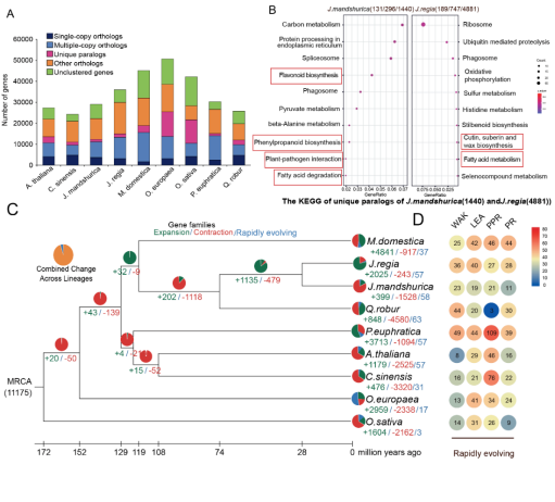 比较基因组显示,核桃楸(J. mandshurica)相比较于核桃(J. regia)缺失1,657个基因和插入2,827个基因。核桃楸包含1,440个特有基因,这些基因主要在黄酮类生物合成,苯丙烷类生物合成和植物与病原体的相互作用等三条通路中起着重要的作用。与其他物种基因家族分析相比,J. mandshurica中四个基因家族(LEA,WAK,PPR和PR)显著进化。