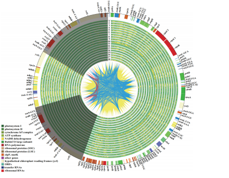 比较叶绿体基因组分析发现,槭树科物种同其他大部分被子植物类似,均存在较为典型的四分体结构。在槭树科物种中鉴定得到了一些正向选择的叶绿体蛋白编码基因,可能与该科物种广泛的环境适应性有关。同时,单亲遗传的叶绿体基因组和双亲遗传的核基因在槭属内存在一些系统发育冲突现象,可能由于槭树科物种频繁的种间基因流/杂交渐渗(introgression)及近期的物种分化导致的不完全谱系筛选(lineage sorting)所致。
