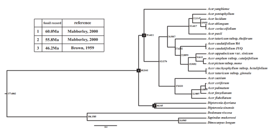 该研究通过下一代高通量测序(Next Generation Sequencing)技术,组装和注释叶绿体全基因组序列和两个双亲遗传的核基因序列,对槭树科物种进行系统发育和进化模式分析。基于两种遗传背景特性的联合基因序列系统发育分析表明,取样的槭树科物种分为槭属和金钱槭属两个大的遗传分支。基于化石标定点的分化时间检测表明,槭属和金钱槭属约在古新世的60.2百万年前发生分化,槭属干群(crown)约在55.4百万年前分化。