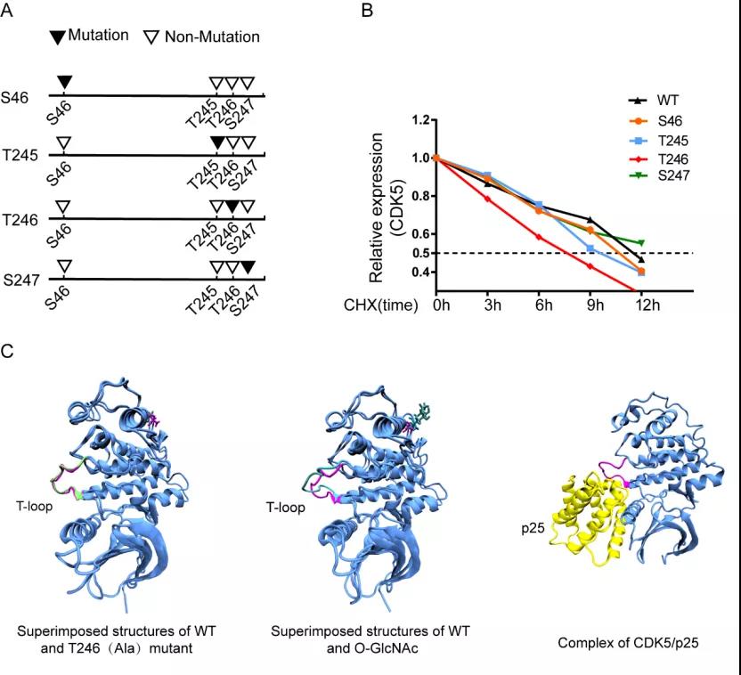 图2:A. CDK5糖基化位点突变示意图. B. CDK5突变后的蛋白半衰期.C.CDK5晶体结构分析.