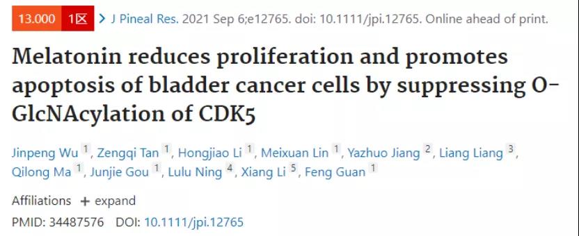 2021年9月6日,公司肿瘤糖生物学团队在《Journal of Pineal Research》杂志(Top一区)上发表题为“Melatonin reduces proliferation and promotes apoptosis of bladder cancer cells by suppressing O-GlcNAcylation of CDK5”的研究论文,介绍了褪黑素通过降低O-GlcNAc糖基化修饰水平抑制膀胱癌增殖的分子机制。