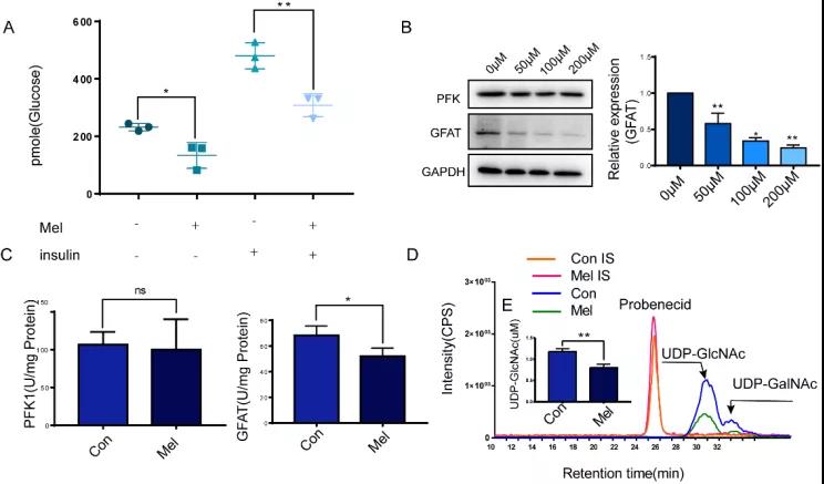 图1:A. 葡萄糖摄入. B. Western blot检测PFK1与GFAT的蛋白表达. C. PFK1与GFAT的酶活. D. 液相质谱检测UDP-GlcNAc的水平.