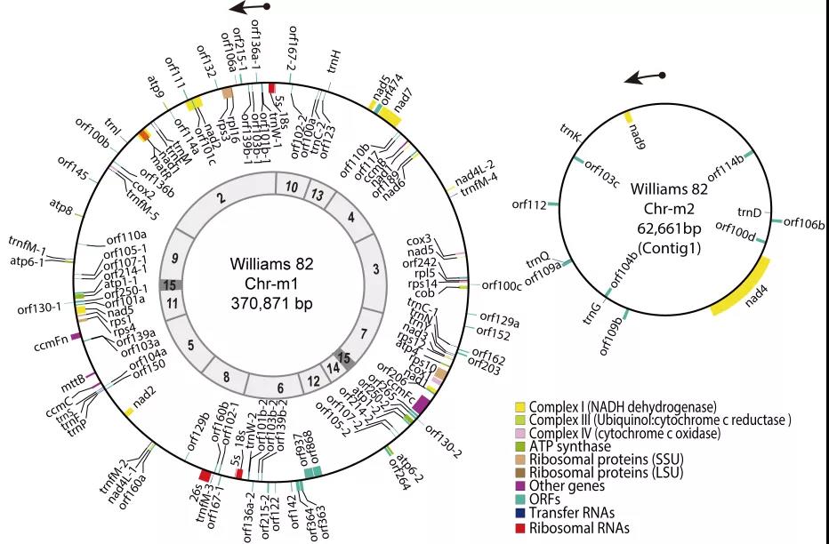 栽培大豆品种“Williams 82”(Wm82)的核基因组是大豆中第一个发布的参考基因组,也是大豆基因功能研究最常用的参考基因组,但其完整的胞质基因组尚未报道。因而,该研究通过高通量测序和Southern Blot/PCR技术,组装了Wm82的mtDNA(Wm82_mtDNA),填补了其基因组中的一个空缺。结果显示,Wm82_mtDNA由两个独立的环型染色体(370,871-bp Chr-m1与62,661-bp Chr-m2)组成。