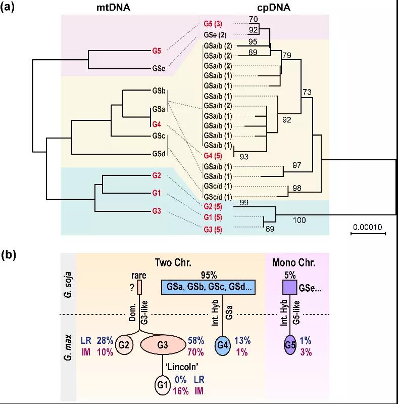 最后,通过对大豆mtDNA结构变异和叶绿体核心基因的序列差异进行系统发育分析,研究人员发现栽培大豆G1-G3的成员聚类在一个分枝上,与野生大豆胞质亲缘关系很远,其中G1 mtDNA由G3 mtDNA演化而来;而G4和G5的成员则分别与野生大豆的GSa和GSe的成员聚在一个分枝上。这充分说明了,栽培大豆主要胞质类型来源于一个祖先,与栽培大豆来源于单一驯化事件相符;而G4和G5类胞质则是通过种间杂交分别从GSa和类似GSe的野生大豆获得。因此,现代的栽培豆的胞质至少有三个不同来源。