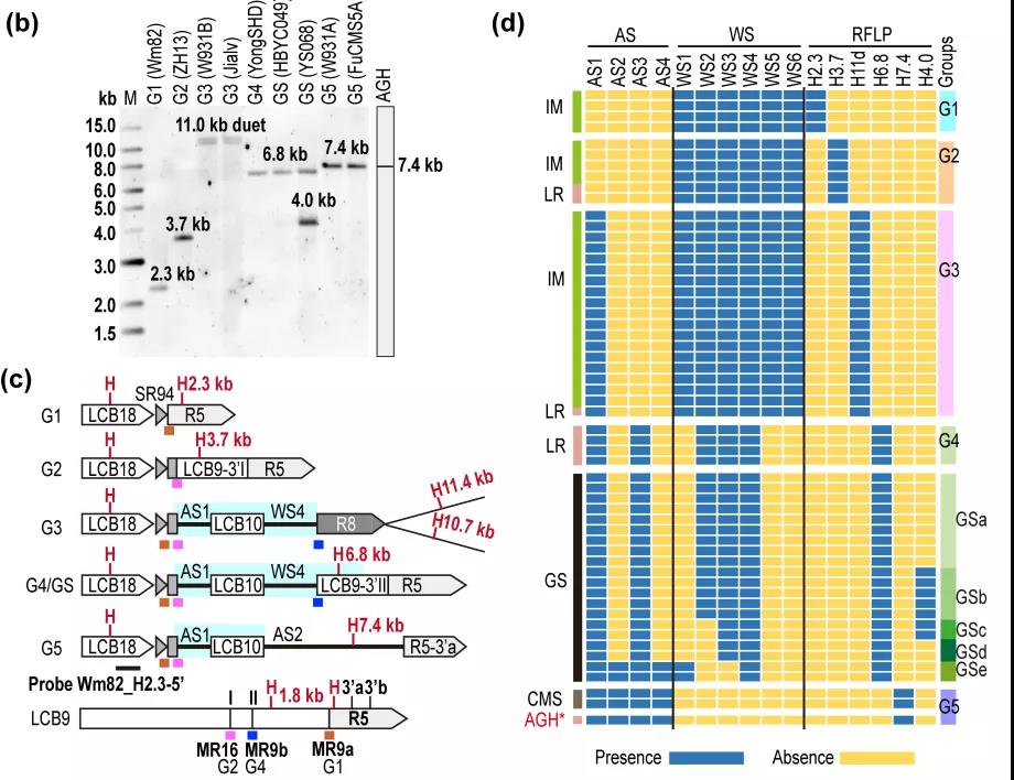 接着,该研究利用结构变异(SV)分子标记,通过PCR/Southern blot实验或同等效力的序列分析研究了39份G. soja和182份G. max的mtDNA遗传多样性。结果,所分析的两个群体均具有5种胞质类群,分别为GSa-GSe和G1-G5,而Wm82和矮杆黄分属于G1和G5(图2)。其中,栽培大豆G1-G4类群在1992年(Grabau 等)曾报道过。