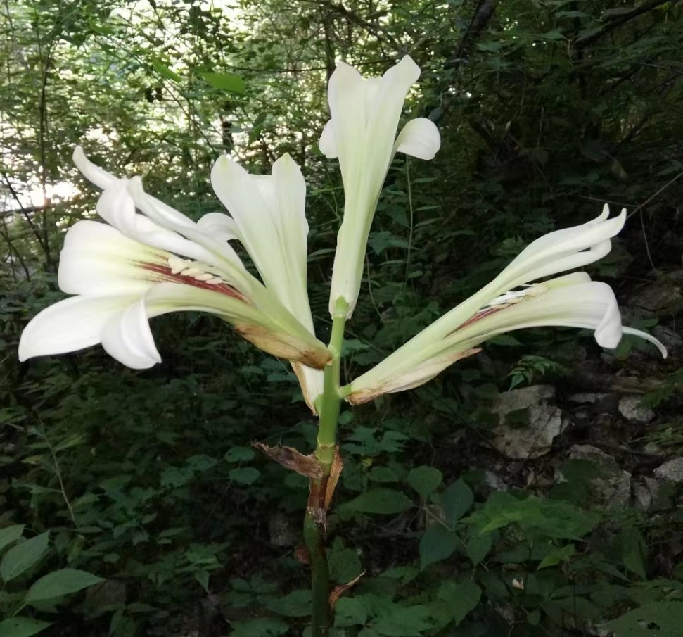 近日,十大外围足球平台app和太平国家森林公园的科研人员在对陕西秦岭生物多样性进行野外调查时,在太平国家森林公园发现了国家二级重点保护植物荞麦叶大百合Cardiocrinum cathayanum的一个野生居群,据统计,该居群大约有50-60株野生个体,该物种是在陕西秦岭的首次发现。据太平国家森林公园的园林工程师姜洋前期踏查,发现大百合属植物在该区域有两种花期存在明显差异的野生个体。2022年7月4日,十大外围足球平台app李忠虎教授带领研究生进行了实地调查和详细考证,并和植物分类学者刘培亮博士讨论分析,确认该物种为百合科大百合属植物荞麦叶大百合。该物种每个花序包含1-5朵花,每个花具苞片1枚,花丝相对较长;而邻域分布的近缘物种云南大百合每个花序包含10-17朵花,小花无苞片,且两物种花期存在明显的差异。