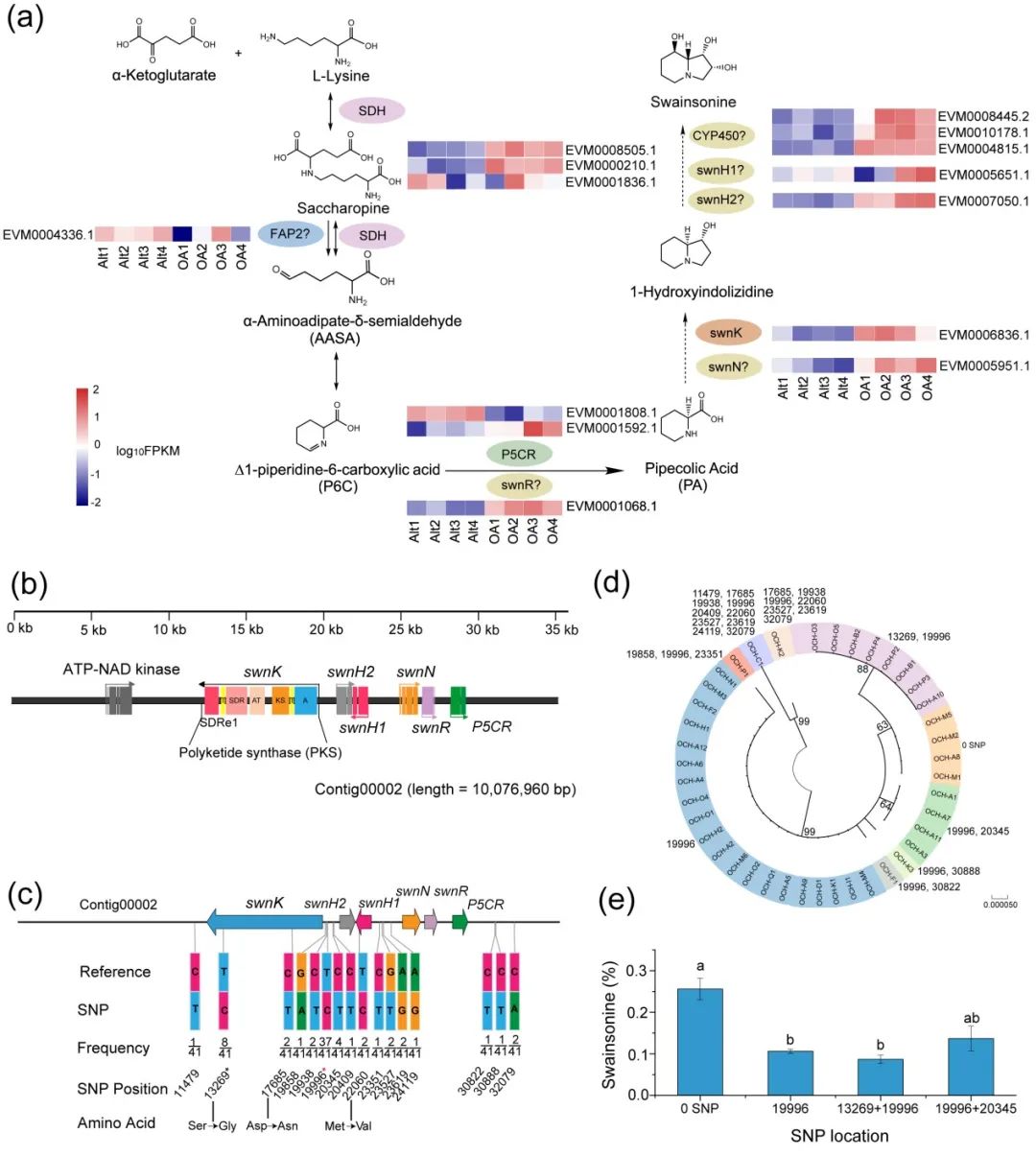 研究丰富了前期推测的SW合成通路,进一步分析显示,一个编码P5CR的基因位于SWN簇上,也包含在SWN的全长序列中。41株A. oxytropis的重测序分析显示,一个位点SNP19996与SW含量相关。