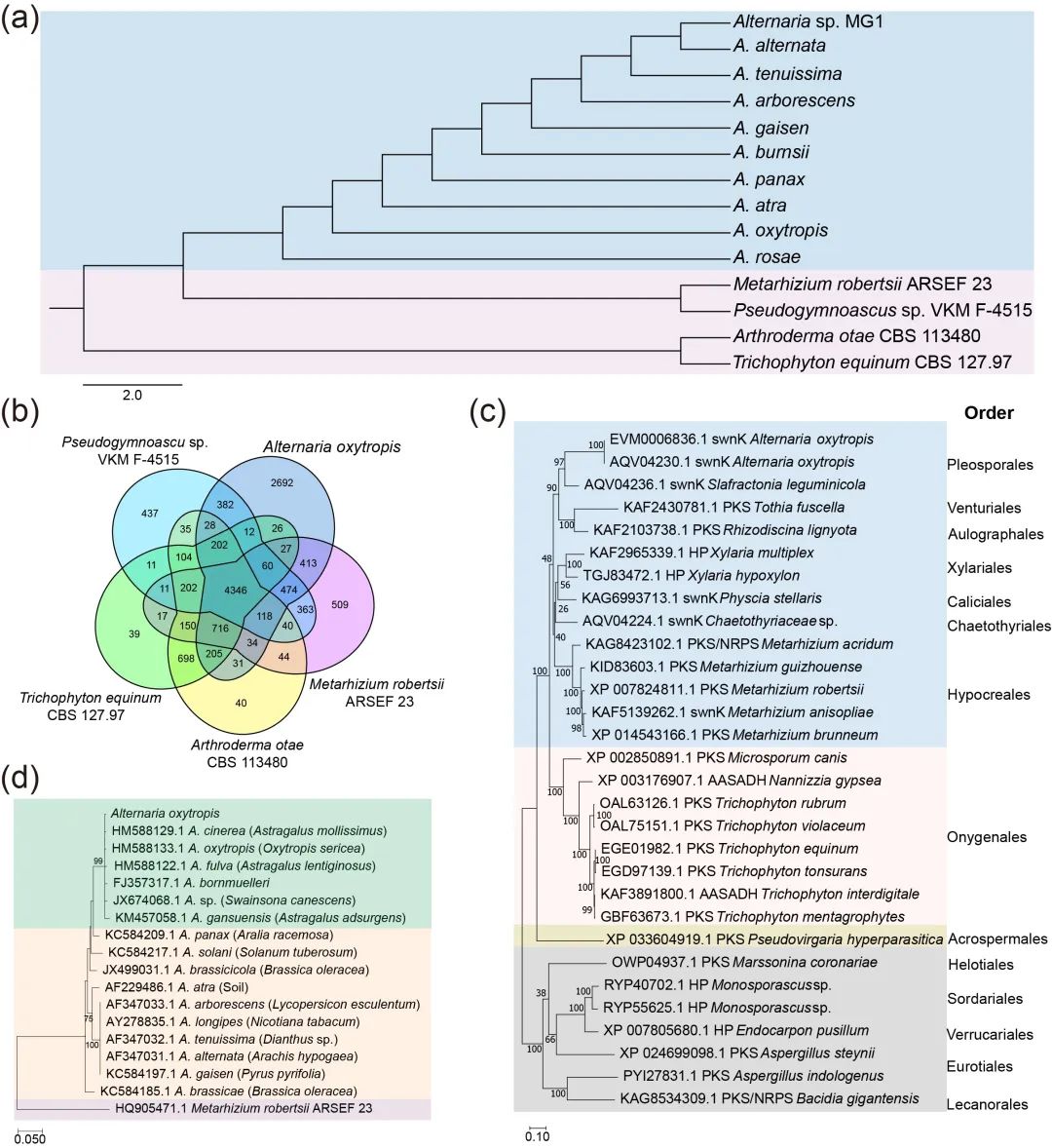 A. oxytropis基因组进化分析显示,A. oxytropis与同属的其他真菌聚在一起,与不同属中产苦马豆素的真菌相比,A. oxytropis具有该物种最丰富的特有基因家族,主要与代谢途径相关。基于SW合成基因簇的关键基因swnK的系统进化分析发现,有14个目的真菌均含有该基因簇。基于ITS系统进化分析发现,Alternaria属内产苦马豆素(含有swnK基因)的物种聚在一起,与不含swnK基因的物种分离。