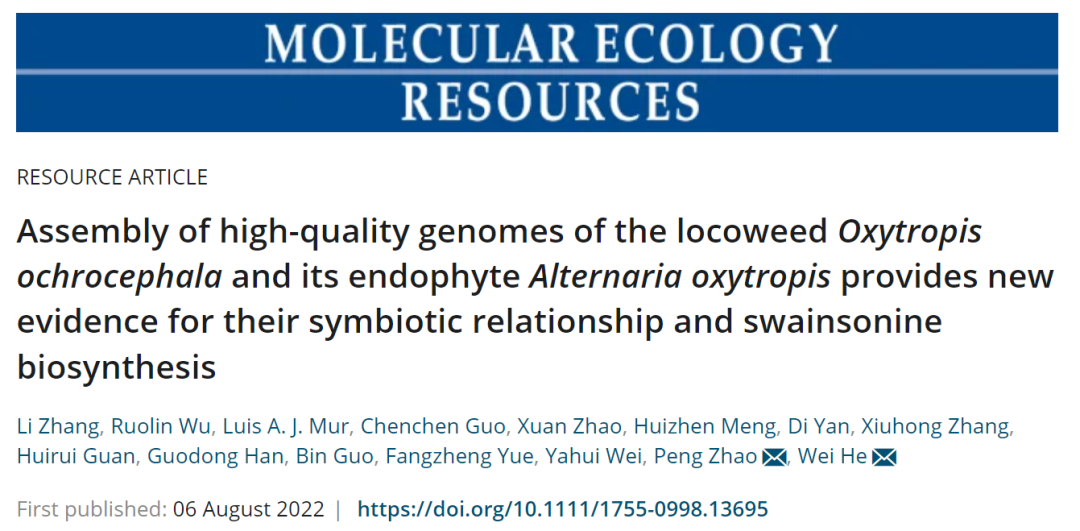 近日,十大外围足球平台app何玮与赵鹏团队合作,以黄花棘豆及其内生真菌为主要研究对象,首次对该植物和与其共生的内生真菌进行了高质量的全基因测序组装注释,分析了两者各自的进化关系和苦马豆素合成关键基因簇的遗传分化;结合其共生/非共生状态下的转录组,分析了两者共生及毒素合成的分子机制;通过重测序,分析了毒素合成关键基因簇的遗传变异对毒素含量的影响。研究发现,黄花棘豆与内生真菌共生可以促进植物的次生代谢及防御基因的表达,促进了内生真菌毒素合成SWN基因簇上关键基因的表达,该基因簇上的部分SNP突变可造成不同菌株产毒能力大小差异。该研究成果以题目为“Assembly of high-quality genomes of the locoweed Oxytropis ochrocephala and its endophyte Alternaria oxytropis provides new evidence for their symbiotic relationship and swainsonine biosynthesis”论文在线发表在国际学术TOP期刊《Molecular Ecology Resources》上(IF=8.678,生物学、生态学1区)。