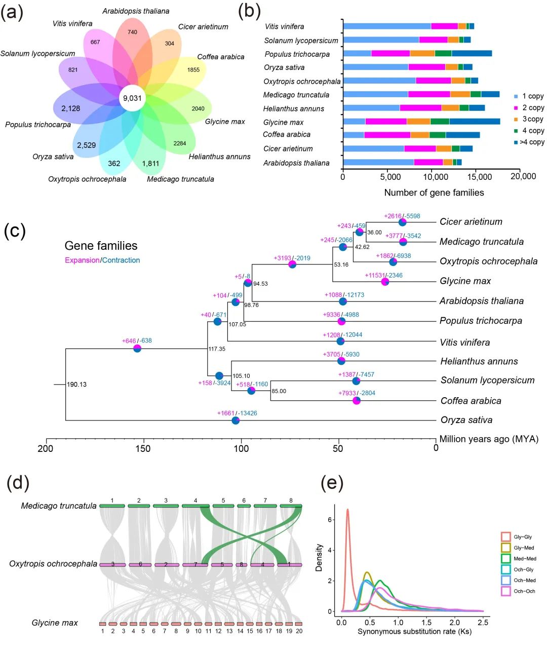 黄花棘豆基因组进化分析显示,其大约于 42.62 百万年前分化出来,且与蒺藜苜蓿(Medicago truncatula)、大豆(Glycine max)具有较近的亲缘关系。黄花棘豆与蒺藜苜蓿之间基因的共线性关系更好,但染色体发生了部分片段的重排,这些重排的基因主要参与代谢途径。黄花棘豆基因组中6,938 个基因家族发生收缩,1,862 个基因家族发生扩张,在进化过程中发生了一次WGD 事件。