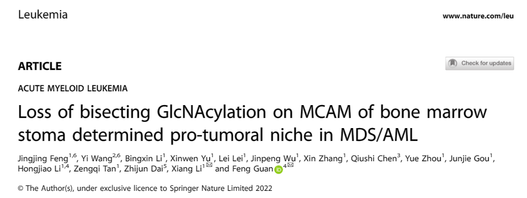 近日,十大外围足球平台app关锋/李想教授团队在基质细胞中bisecting GlcNAc影响黏附因子MCAM表达并重塑骨髓增生异常综合征(MDS)或急性髓系白血病(AML)骨髓微环境的机制研究中取得新进展。研究结果以研究长文(Article)形式发表在血液肿瘤学权威期刊《Leukemia》杂志上,题名为"Loss of bisecting GlcNAcylation on MCAM of bone marrow stoma determined pro-tumoral niche in MDS/AML"。
