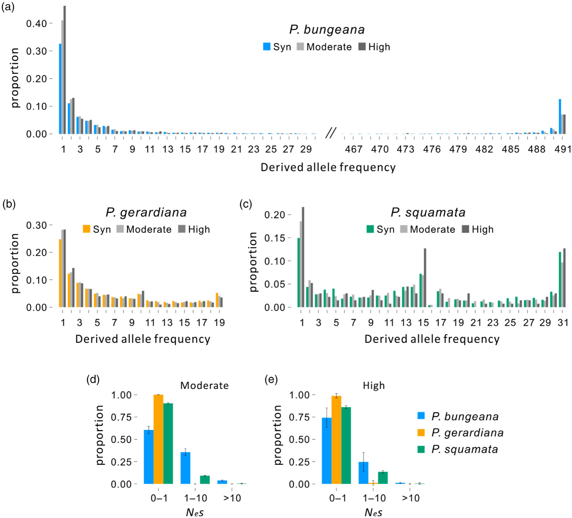图2 白皮松组物种同义突变(Synonymous)、中度有害突变(Moderate)和高度有害突变(High)的衍生等位基因频谱