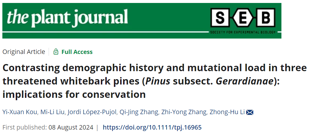 近日,十大外围足球平台app李忠虎教授团队在植物学领域国际知名期刊The Plant Journal(中科院一区TOP期刊,五年IF=7.1)在线发表了题为“Contrasting demographic history and mutational load in three threatened whitebark pines (Pinus subsect. Gerardianae): implications for conservation”的研究论文,探讨了松属白皮松组植物的群体历史动态及遗传负荷模式,并揭示了其濒危机制及环境适应潜力。