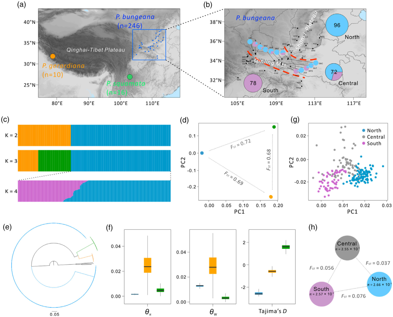 群体进化历史和突变负荷对于濒危物种的适应至关重要。然而,物种群体进化历史和遗传负荷对于珍稀濒危针叶树木物种适应潜力的影响机制仍然未得到良好解析。白皮松组是隶属于松科(Pinaceae)松属(Pinus)单维管束松亚属(Subgen. Strobus)的一类珍稀针叶植物,该组仅包含三个物种:白皮松(P. bungeana Zucc. ex Endl.)、西藏白皮松(P. gerardiana Wall.)和五针白皮松(P. squamata X. W. Li)。这三个物种具有差异化的濒危状态和地理分布,其中,白皮松是白皮松组分布最为广泛的植物,被国际自然保护联盟列为濒危物种;而西藏白皮松和五针白皮松分布范围狭窄,被列为极度濒危物种。本研究利用群体转录组、叶绿体基因组和线粒体DNA标记数据,结合生态位模拟分析,对白皮松组物种的分化历史、群体历史动态变化及其濒危机制进行了研究。