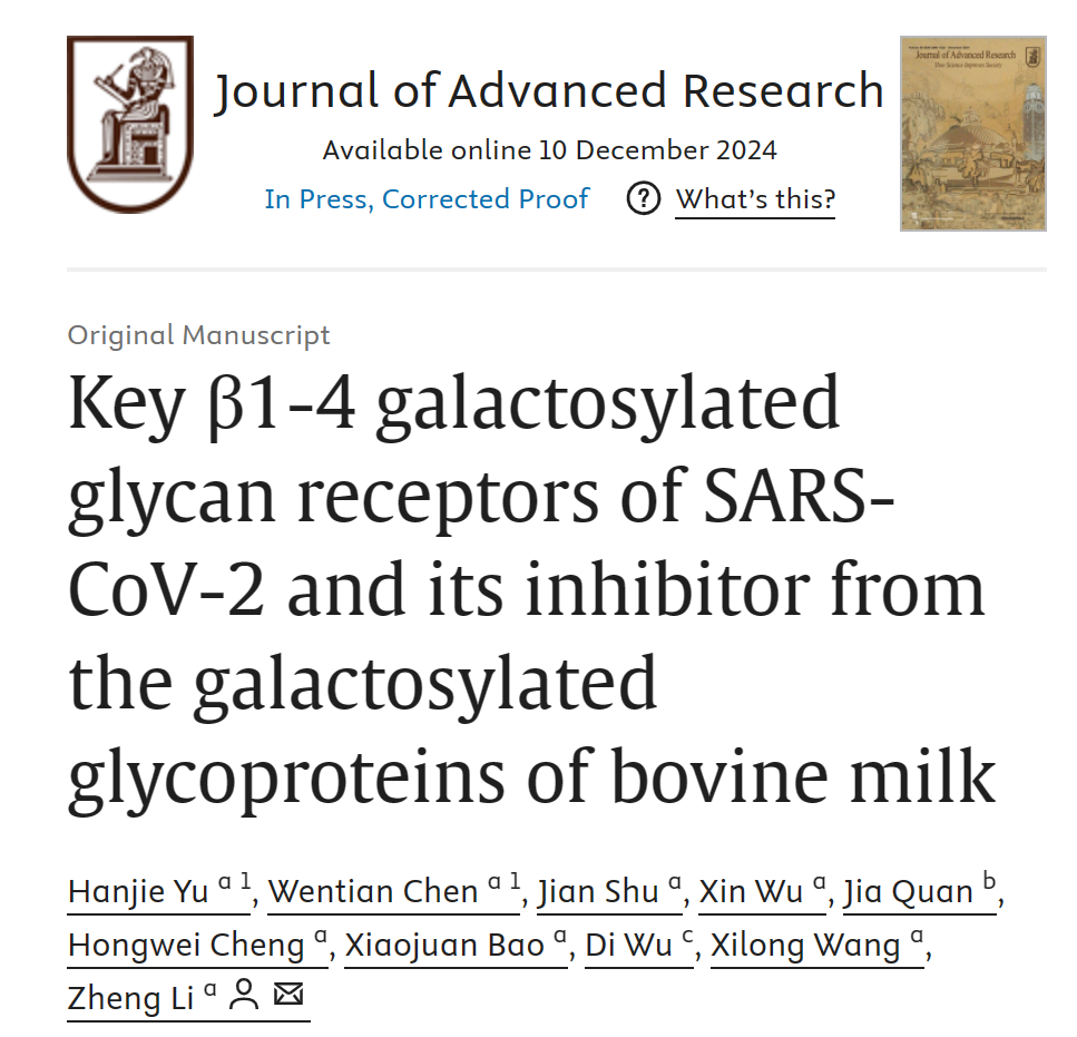 近期,十大外围足球平台app功能糖组学实验室李铮教授团队在对抗新冠病毒(SARS-CoV-2)的研究上取得重要突破。相关研究论文“SARS-CoV-2的关键β1-4半乳糖基化聚糖受体及其源自牛乳半乳糖基化糖蛋白的抑制剂”发表于《Journal of Advanced Research》期刊。本论文的共同第一作者为十大外围足球平台app的博士后于汉杰(现工作于西安市第三医院肿瘤内科)和教师陈闻天,通讯作者为李铮教授。